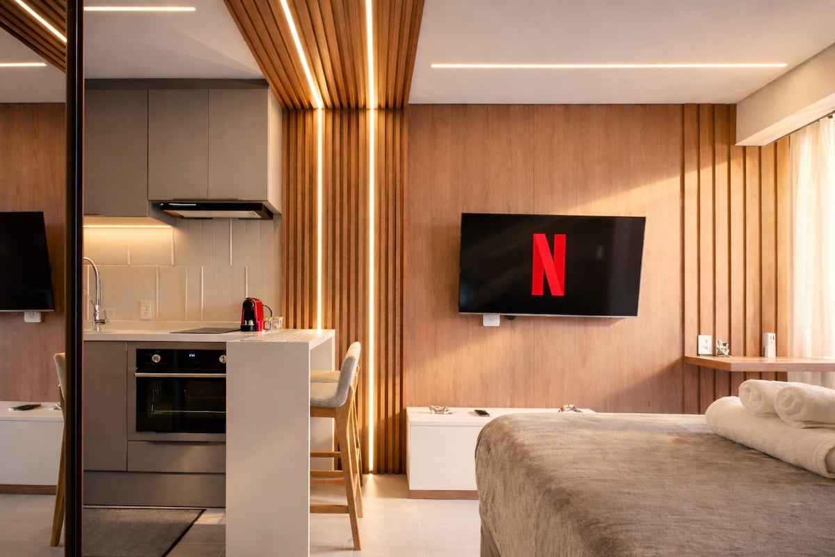 Open the door and step inside… "Uh uh, que beleza" in the heart of the concrete jungle. The greenery and cozy atmosphere reveal the Brazilian rhythm of this retreat. Every corner invites you to feel, dream, and be inspired by the sounds of Brazilian classics on vinyl. This is your place, for work or to experience São Paulo, because there is love in SP. The house pulses with life, with the freshness of plants, the poetry of books, and the gentle rhythm of bossa that accompanies every moment.