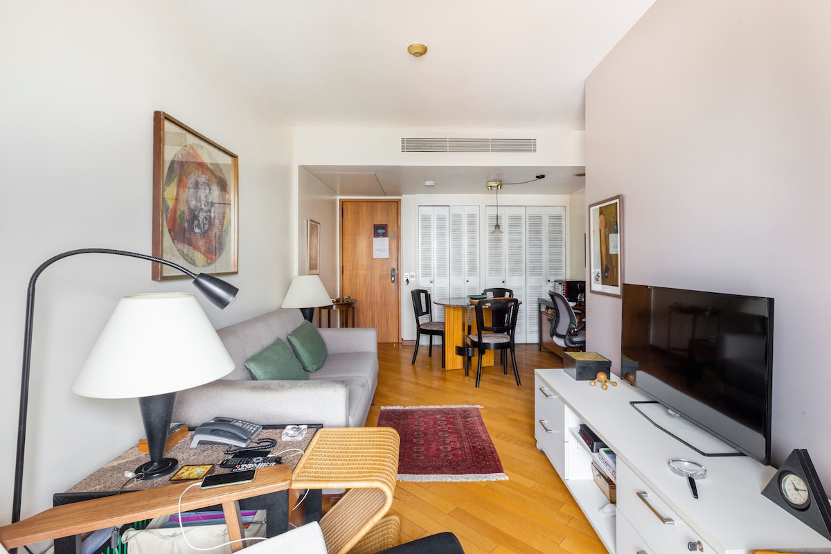 Stylish 50 m² apt. located at Bela Vista, has 24hr doorman. 2 bedrooms (only 1 with AC, and queen bed, the second one is quite small and can be used as an office, fitting a double-sized sofa-bed) and 1 bathroom. With amazing views from every window, it is a great place to work and relax. The private jet-tube at the balcony is a fantastic spot to enjoy the city views. Ideal for couples, professionals or small families looking for comfort, convenience, and one of the best views in the city.