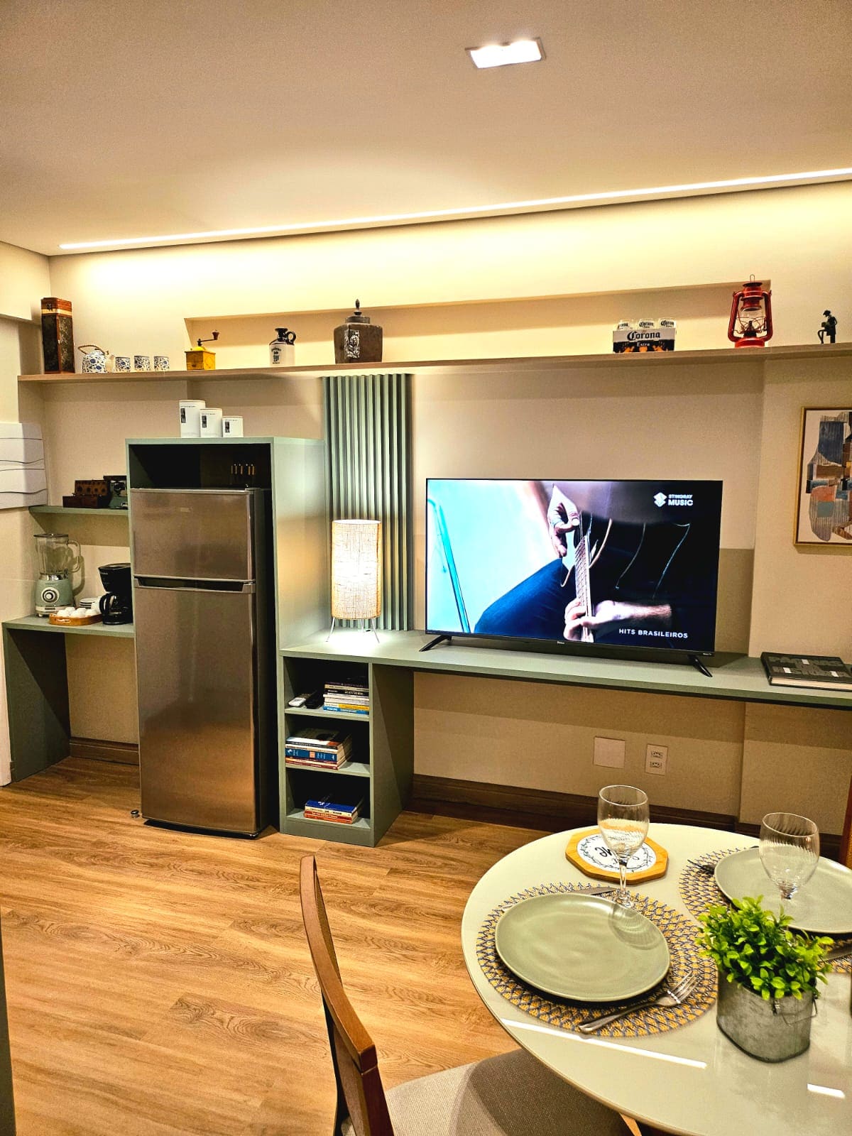 APTO completo, cozinha completa e espaço de trabalho exclusivo. Prédio novo, recepção de hotel ( 24h, confortável e wifi ) Paisagismo que estende a vegetação da praça vizinha, envolvendo as áreas comuns nesse jardim tropical. A 500m do metrô , perto e longe o suficiente dos encantos da Vila nessa rua que mais parece uma praça no interior. A piscina no rooftop é um capítulo à parte.