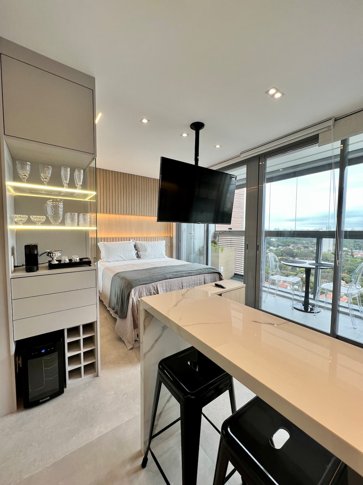 Estúdio Novo com Vista Panorâmica — 24º Andar com Piscina Infinita e Estilo! Desfrute de São Paulo com conforto e estilo em nosso estúdio montado com carinho para recebê-lo. Localizado no 24º andar com *vista envidraçada de 180° para a Marginal Pinheiros*. Um refúgio moderno, ideal para quem busca praticidade, comodidade e uma experiência diferenciada na cidade.