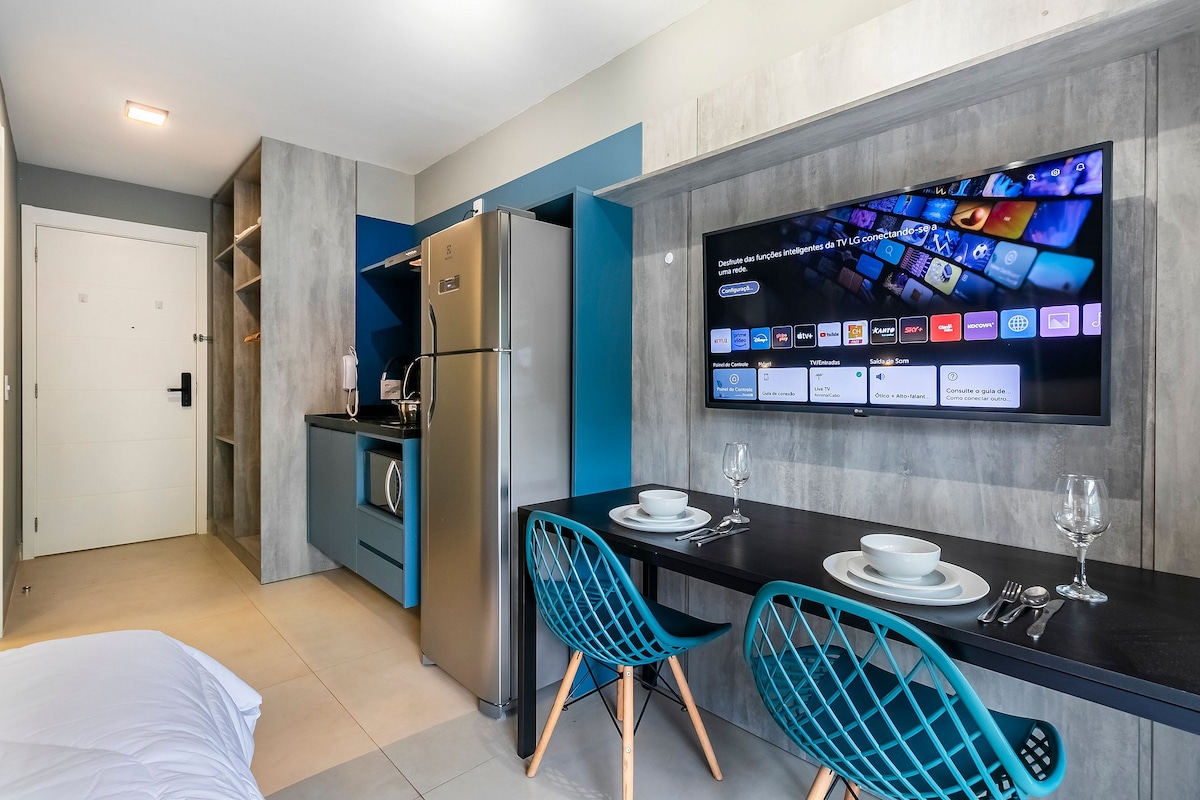 Enjoy São Paulo in an incredible location with full leisure facilities, free parking, a fantastic swimming pool and gym on the Rooftop, Coworking space and a self service grocery store. Fit industrial style built to give comfort 20m from Oscar Freire and 1 minute from Metro Oscar Freire. Come enjoy in the best building in the region. The apartment has a full kitchen, WiFi, coffee maker, toaster, Nespresso, iron, hair dryer, pots and pans set. Also enjoy our Buddenmeyer bedding and our big shower