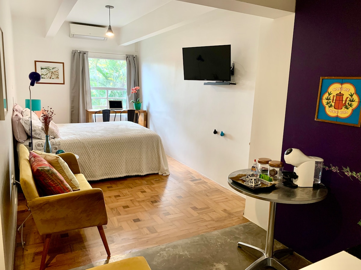 charmoso estúdio de 30m² na Vila Madalena, a 400 metros do metrô, ideal para quem busca conforto, praticidade e um ambiente inspirador. Além de uma vista para a área verde, o espaço oferece duas áreas dedicadas ao trabalho. E, se preferir, aproveite o jardim para trabalhar ao ar livre e relaxar. O estúdio conta com Wi-Fi de alta velocidade, cozinha completa, banheiro privativo e uma área de café dentro do espaço para começar bem o dia. Para sua comodidade, oferecemos lavanderia gratuita