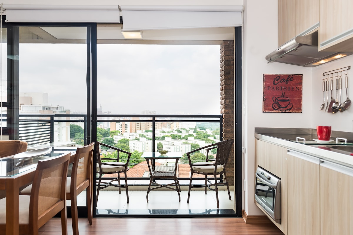AMAZING VIEW! Well equipped & tastefully decorated charming apartment in the vibrant and bohemian neighbourhood of Vila Madalena. Located close to shops, bars, restaurants, and galleries with that unidentifiable vibe that only the coolest neighbourhood in a city exudes. Walking distance to most places and safe to walk. Building with complete infrastructure including pool, gym, coworking and Mini-market with all essential items. *NEW AIR CONDITIONER* *NEW POTS & PANS*