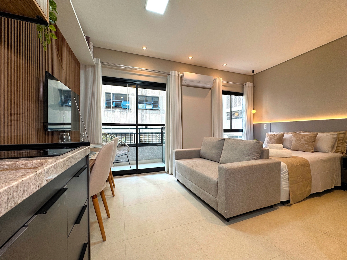 Relax in the best location of São Paulo, between Jardins and Pinheiros. This newly opened studio is a 5-minute walk to the Oscar Freire subway station, in a new building with all the infrastructure for a quiet and comfortable stay. It is on top of a bakery with artisan bread and across the street from a supermarket. The building has coworking and coliving space, laundry room, gym, rooftop pool, and a 24-hour doorkeeper. Wi-Fi 450Mbps.