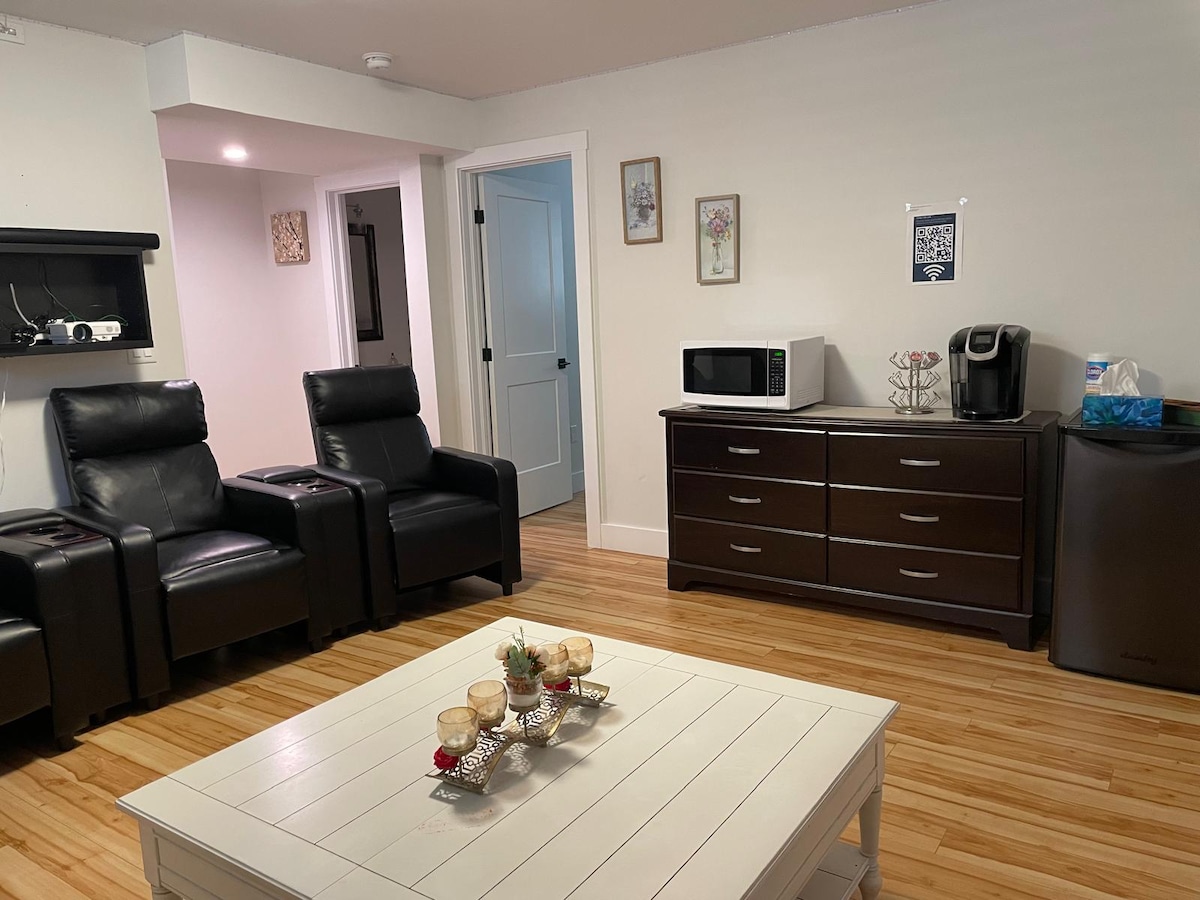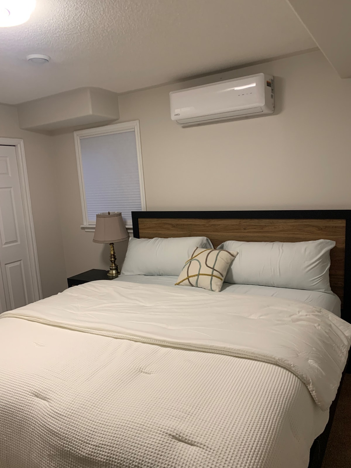 Kick back, reminisce and relax in this calm, stylish space. This basement apartment in South Bedford offers the most important amenities with class. The open concept sitting area is nestled between the dinning and equipped kitchenette. The bedroom offers a comfy king-sized bed, a working area, a dresser and a nightstand. The toilet is equipped with both automatic sensors and energy-efficient flushing mechanism. Finally, a heat pump helps moderate temperatures within the apartment all year round.