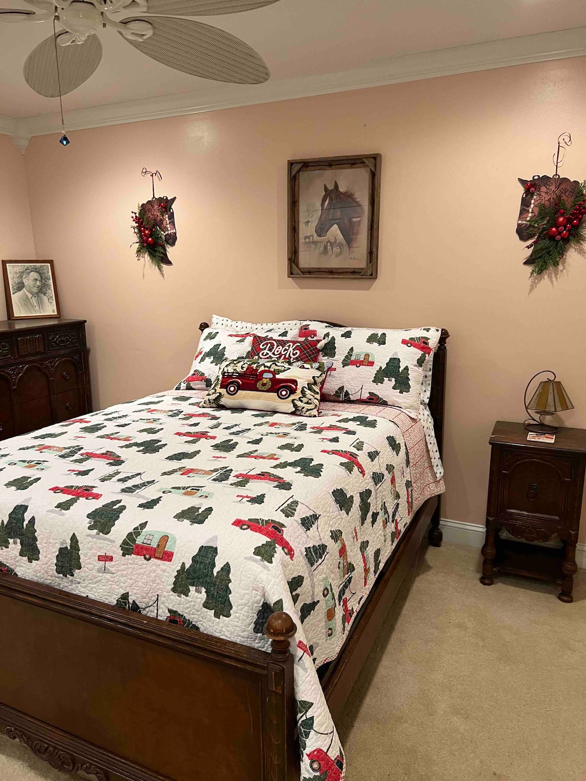 Horse friendly ranch in Shelbyville, TN ready for your special visit. 13 lovely acres to enjoy just 5 minutes from downtown theater and restaurants, shopping, etc.Nicely landscaped with beautiful interior rooms, spa, and wonderful grounds to relax. Many fireplaces, baby grand piano,great outdoor views and fun. If you select Listing 1 = Queen size bedroom & shared full bath. Options for larger groups check out Listing 2 and or Listing 3.
