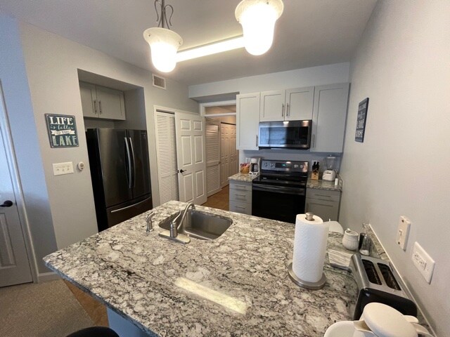 Come savor the breathtaking lake and mountain views and experience the best of Bernards Landing in this condo! Enjoy the best amenities - high end stainless appliances, big flat screen TVs, keypad door access – and the list goes on! River Rock Tiled Shower and Silestone Counters! Bernard’s Landing offers so much – 2 outdoor/1 indoor pool, hot tub, beach, gym, sauna, boat launch, courtesy dock, tennis, pickle ball, racquetball courts, The Landing Restaurant, and more!