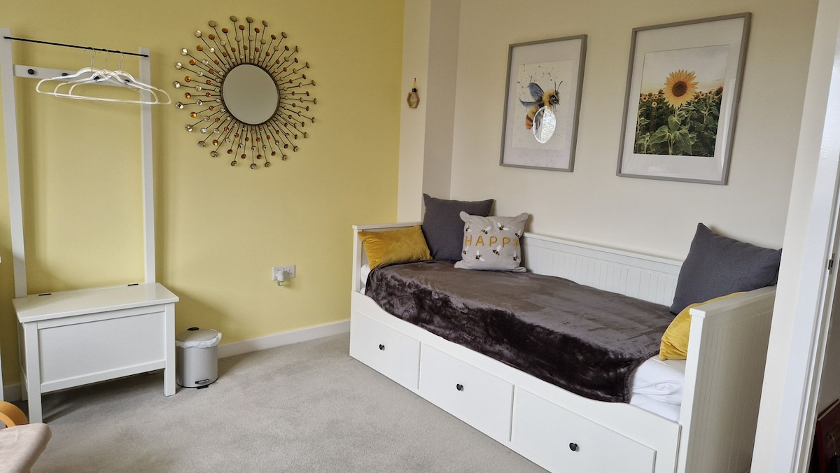 A newly decorated annex with private entrance, ideal for short and longer stays, provides a welcoming open-plan space with a lounge/diner/kitchenette, bedroom, bathroom, and unlimited fast wifi. Bedroom: Double bed, small wardrobe, hairdryer, iron&board. The kitchenette: sink, hob, micro/combi, dishwasher, fridge, toaster, kettle, cups, plates, cutlery. Breakfast cereals, tea, coffee, and milk are provided. Bathroom: shower, w/c, hand basin, shaver/toothbrush socket, towels, and hand soap.