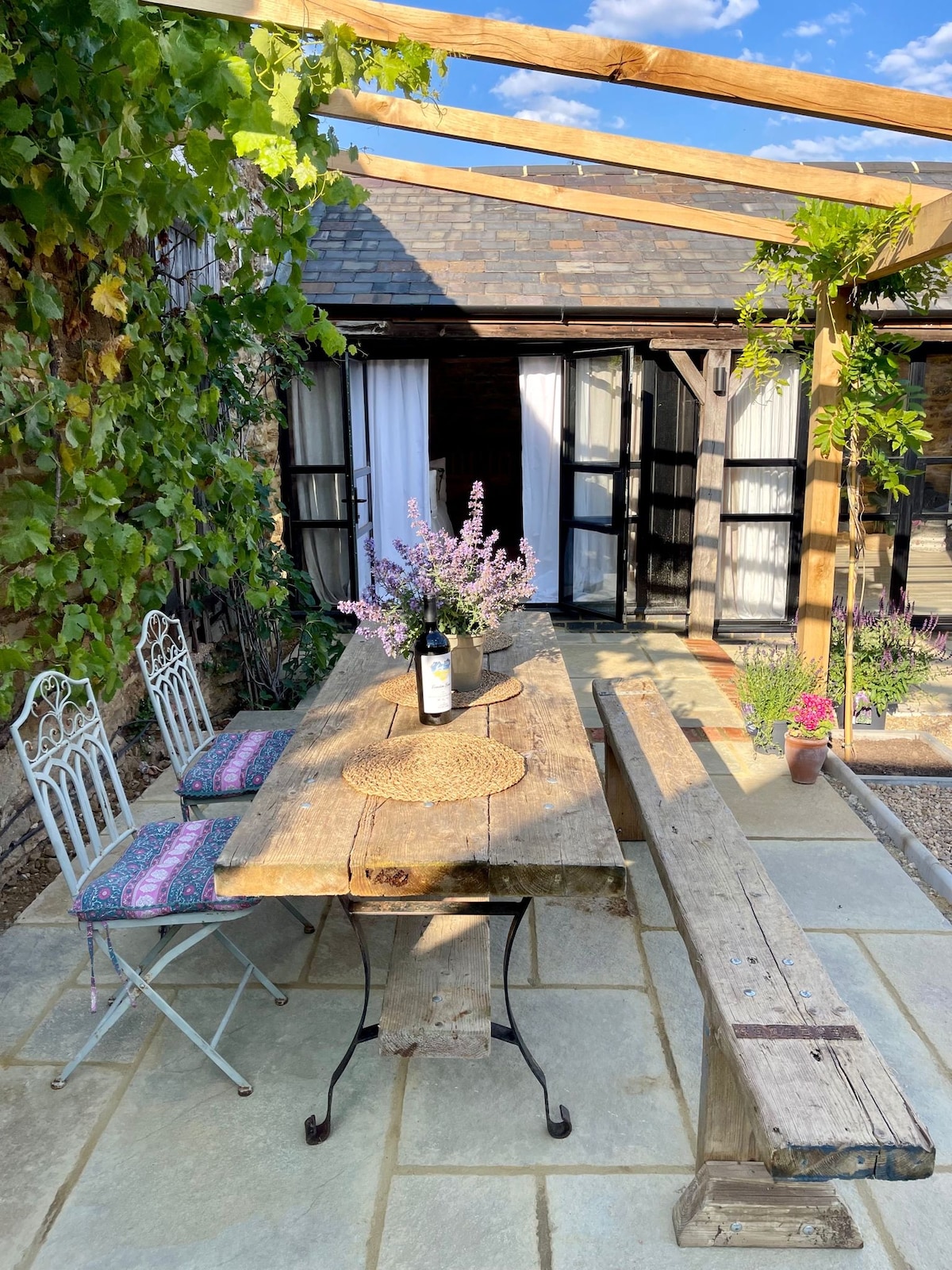 Unique barn conversion in the village of Walgrave, Northamptonshire. Originally the 200 year old building housed farm animals and in 2023 it was converted into a fully furnished property with underfloor heating, bedroom, bathroom, kitchenette and large floor space that can be used as a gym. There is private parking in the courtyard area with an outdoor dining table and grapevine backdrop which captures the sun all day long making it a lovely space to relax in. Any questions please ask. Tom