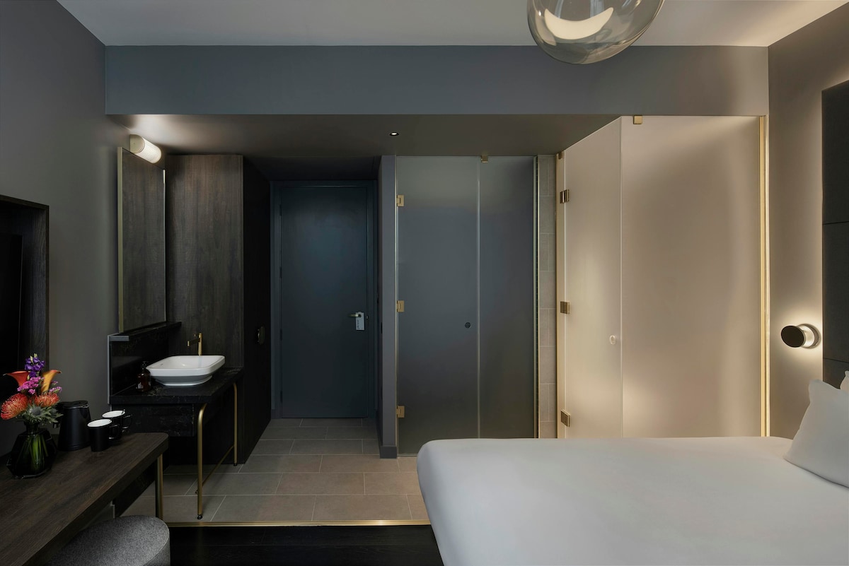 The Grande Studio at Roomzzz Stratford offers a spacious and thoughtfully designed space, perfect for extended stays or added comfort. Spanning approximately 31 square meters, it features a plush king-size bed, a sleek en-suite bathroom, a fully equipped kitchenette, and a dedicated workspace. The modern layout combines style and practicality, ensuring a relaxing and luxurious experience.