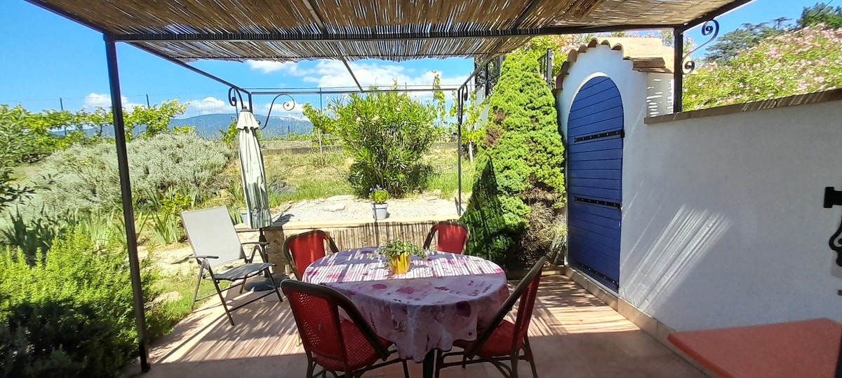 A 500m à pied du village pittoresque de BEDOIN au pied du Mont Ventoux, charmant studio de plein pied CLIMATISE - baie vitrée donnant sur le jardin, terrasse privative vue piscine (chauffée en été). Entrée indépendante, possibilité de garage fermé pour des vélos. Le T2 comprend : une grande chambre Zen, un coin salon -repas donnant sur la terrasse privative, transats et table-chaises de jardin pour déjeuner et vous détendre. Zénitude et calme assurés avec pour seul réveil le chant des oiseaux !