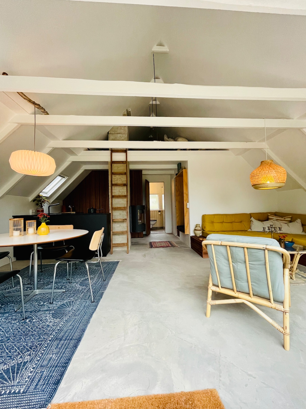 If you are looking for a quiet, relaxing and cozy cottage with sauna to spend quality time in nature, this small summerhouse (65 m2) is the ideal spot. It has 2 separate bedrooms, 1 open bedroom upstairs (hems) and 1 bathroom. A heat pump and wood stove keep the house nicely warm. Outside is a 55m2 big terrasse with an amazing outdoor fireplace to spend a good time together. The summerhouse is located at a peaceful spot with 4 min walk to a grocery store and 12 min walk from the beach.