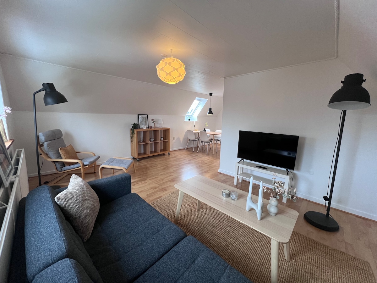 Hyggelig ferielejlighed på 1. sal i smuk, ældre villa. Lejligheden rummer to værelser, stue med udgang til lille altan, samt eget køkken og bad. Der er plads til 4 personer - plus evt. ekstra opredning på god sovesofa i stuen. Køkkenet indeholder komfur/ovn, køleskab, kaffemaskine, kogekande – og naturligvis diverse grej og service. Der kan aftales adgang til vaskemaskine/tørretumbler i husets kælder. Indgang gennem husets entre, men derudover er det en separat lejlighed.