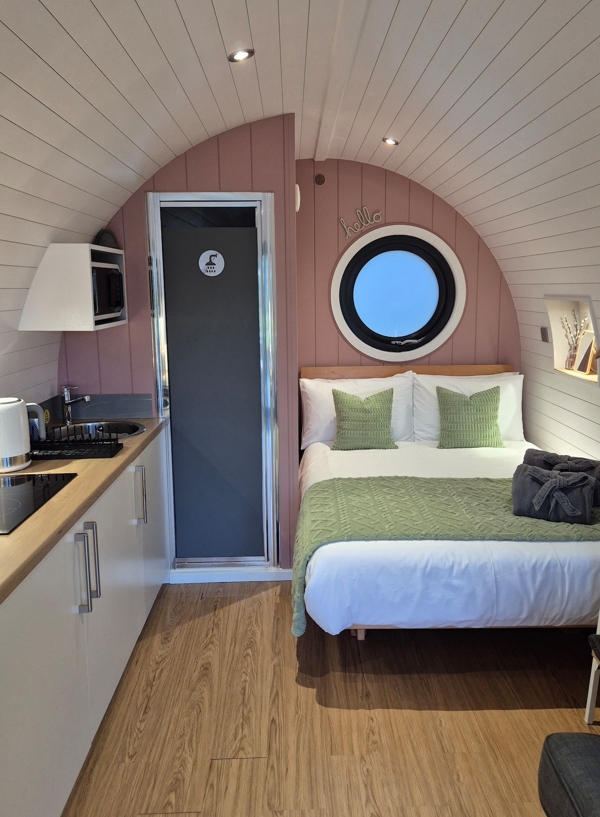 Nestled in the beautiful South Shropshire Hills, on the edge of a working farm, the Stretton Pod is one of three luxury pods (view others on my profile). With plenty of scenic walks from the door, this cosy pod provides the perfect escape to relax and unwind. The accommodation has been individually designed and furnished in a bespoke style, including a hot tub, wet room and cooking facilities. Luxury 100% cotton bed linen, towels and robes are provided, along with a few basic supplies.