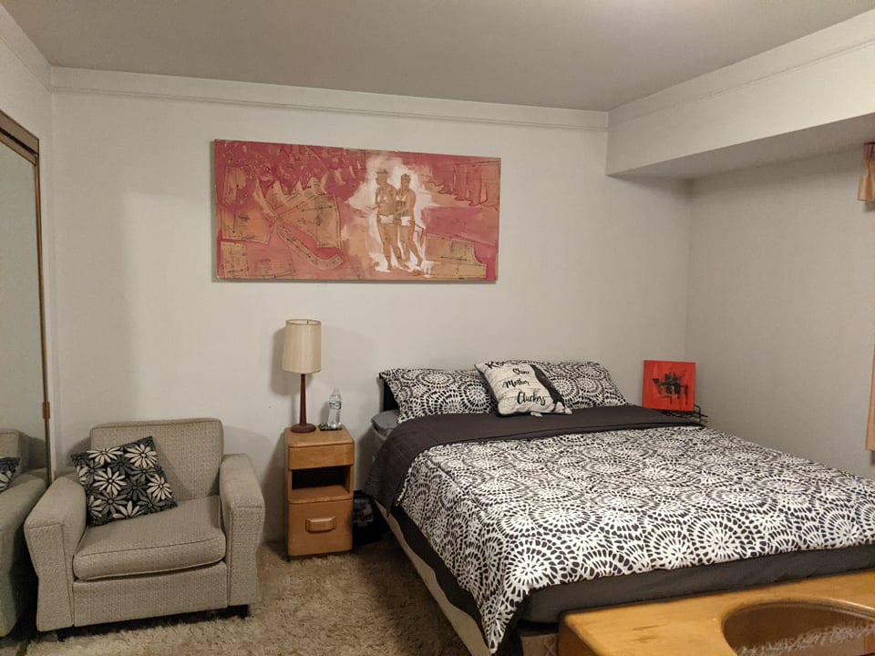 Now dog friendly! Relax in your own quiet, comfortable guest suite. This lower level private space has a keyless entry for self check-in and is accessible by a set of stairs adjacent to your dedicated parking spot. The comfortable bedroom has a queen sized bed. A kitchenette and generous sized living area offer everything you may need for a comfortable stay. Unwind on our new secluded patio. Take advantage of the inviting hot tub, ideal for a relaxing evening.