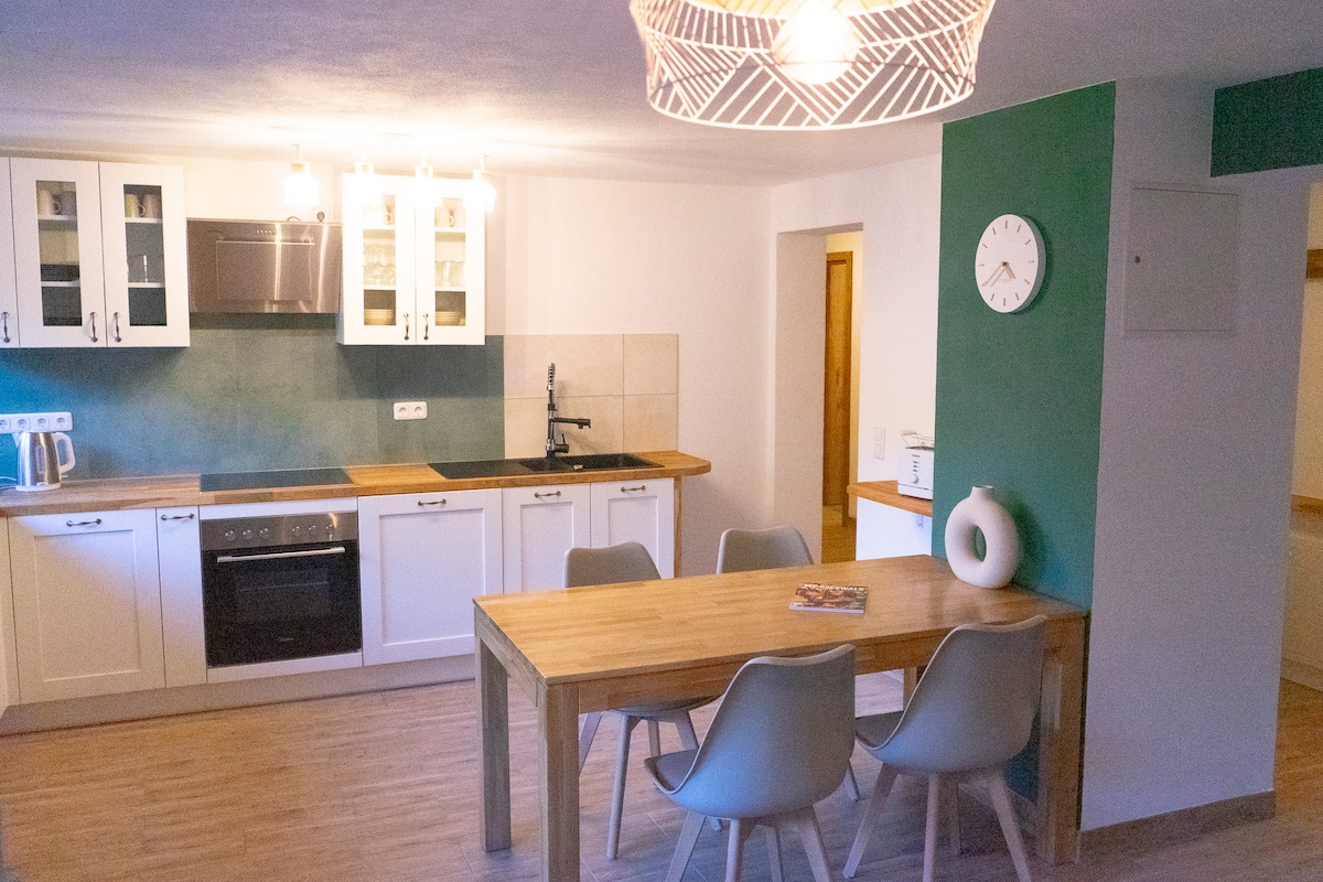 Herzlich Willkommen im Ferienhaus Königshalle Hier erwartet sie ein liebevoll eingerichtetes Ferienhaus mit Platz für 6 Personen verteilt auf ca. 100qm. Der Wohnraum im 1. OG verfügt über eine voll ausgestattete Küche mit gemütlichem Wohn/ Essbereich und einem Kachelofen . Mit dem direkten Zugang auf die überdachte Terrasse lässt sich fast bei jedem Wetter das Essen im Freien genießen. Ebenfalls befindet sich der Hauswirtschaftsraum mit Waschmaschine / Trockner und ein Gäste WC auf der Etage.