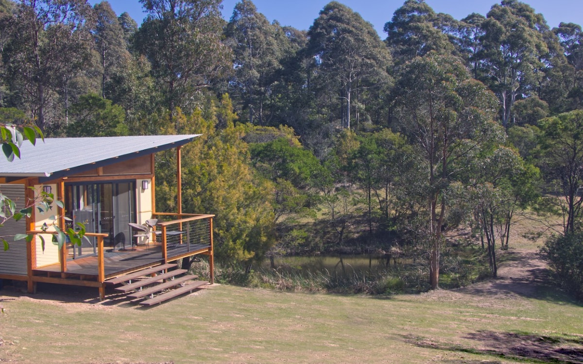 The Lily Pond Cabin is one of a pair of bespoke cabins on our farm. Artistic and comfortable , full of art and personal touches, including my handmade pottery. There is unlimited NBN, so you can stay connected, in the peace of nature Next door is the shared Sunny kitchen, with a BBQ, a handmade dining table and wonderful views to the sacred Mumbulla Mountain. The water you can hear flowing into the lily pond is home to frogs who will serenade your quiet walks out into the starry night..