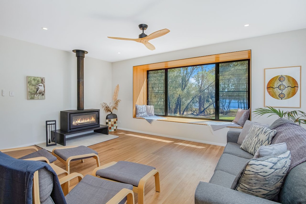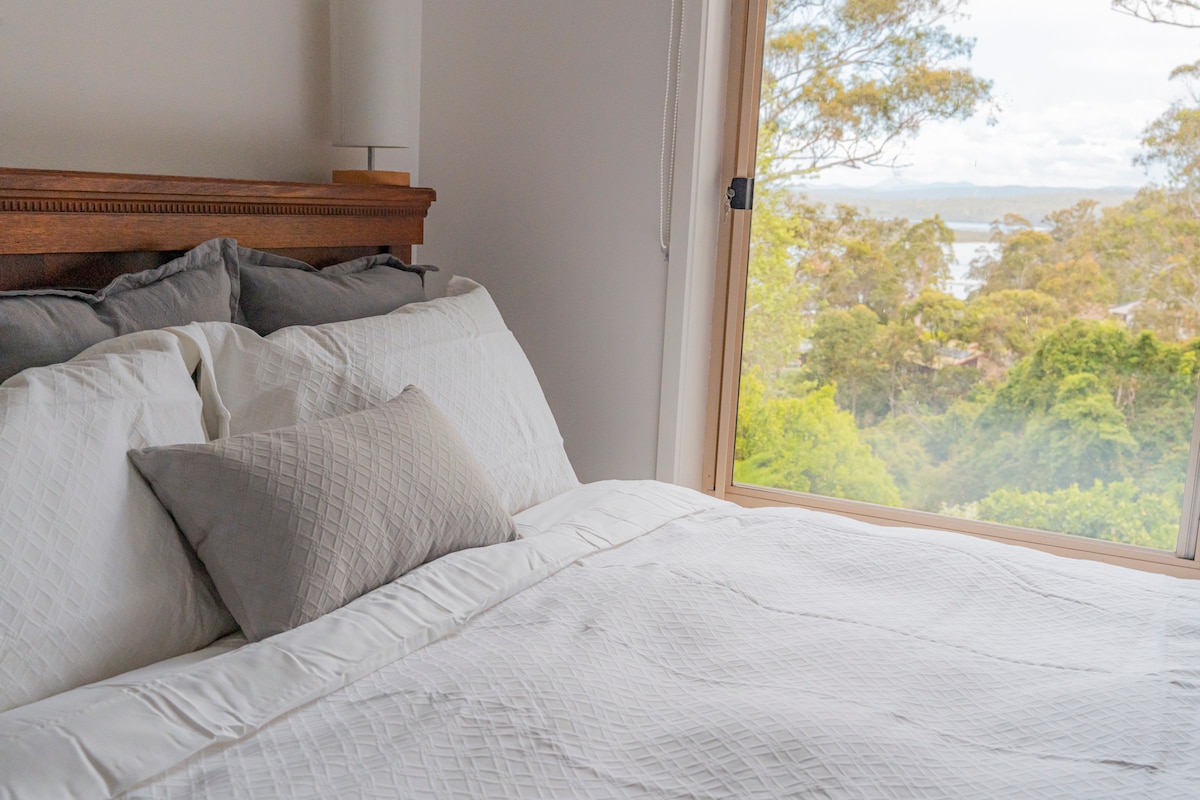 Stay in this private unit, with a stunning garden view overlooking Merimbula Lake. You'll be surrounded by trees and the melody of bell birds throughout your stay. Explore the tranquil Merimbula Boardwalk, the nearby Sunny's Cafe or take a pleasant walk to the town centre or to the Main Beach. Your self-contained accommodation, downstairs and below our home, is 5 minutes away from the airport, yet is a serene space with wildlife in abundance in the green adjoining nature reserve.