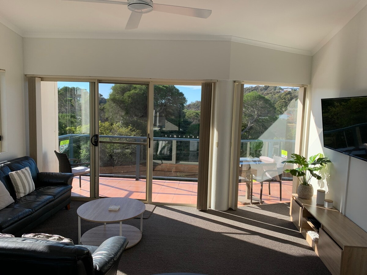 Newly renovated 2 bedroom ground floor apartment offering complete privacy with exceptional views of Merimbula's emerald ocean and lake. Self contained unit, including fully equipped kitchen and Weber BBQ facilities. Ideal location, on your doorstep is access to the new lake view elevated board walkway enabling a 5 minute walk to Bar Beach (with seasonal kiosk + BBQ facilities) and 15 minute walk to the main high street. A 5 minute drive away is the Merimbula boardwalk.