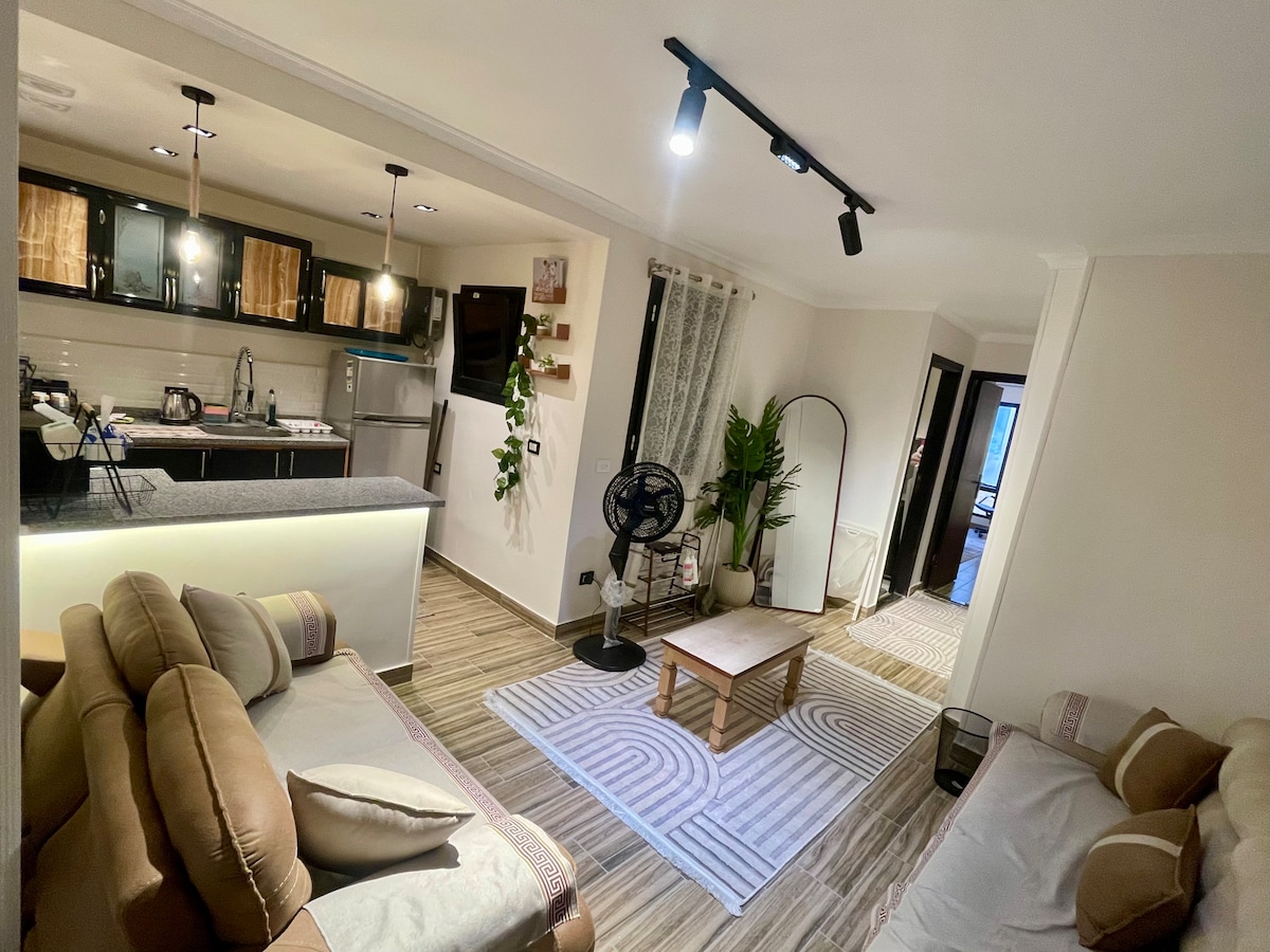 Studio in the heart of Kafr Abdou with open-plan living, sofa, smart TV, kitchen and queen bed. Only the bedroom is air ax‑conditioned; the living area uses fans. Enjoy fast Wi‑Fi and a spotless bathroom. Steps from cafés, shops and transport with 24/7 security and lift. Ideal for couples or solo travellers. House Rules: Please respect the space. No parties, smoking or pets. Registered guests only; no unapproved visitors. Arab-nationality couples must show a marriage certificate.