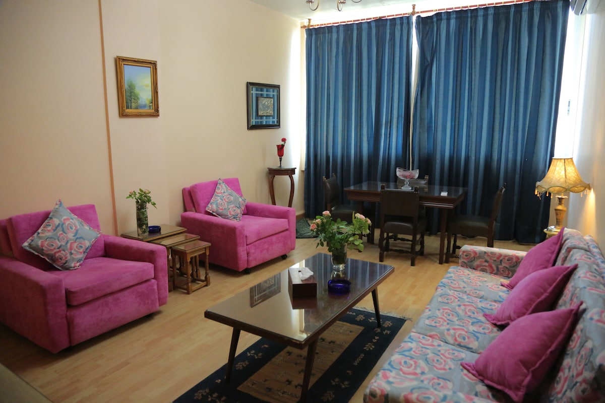Barhaam House is in the heart of Beirut with a panoramic view. It has a spacious living room with smart TV and free Netflix, a cozy dining area, and a fully equipped kitchen. The flat enjoys light from sunrise in the kitchen to sunset in the living and dining room. The master bedroom has a king-sized bed and bathroom with vibrant Algerian tiles. The second bedroom, a royal guest room, also suits children. Expect a soulful stay with curated art, bold colors, and global design treasures.