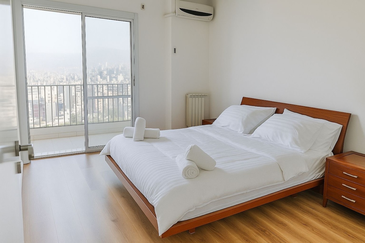 This unique place , located in the heart of beirut consider it Your dream suite its contemporary brand new one bedroom apartment . designed and furnished on a very high end scale with beautiful skylight. The apartment is very lit and airy with a lofty view from the last floor overlooking to sodeco square and Sama beirut , fully equipped with AC and solar panels to give you the best hosting experience .