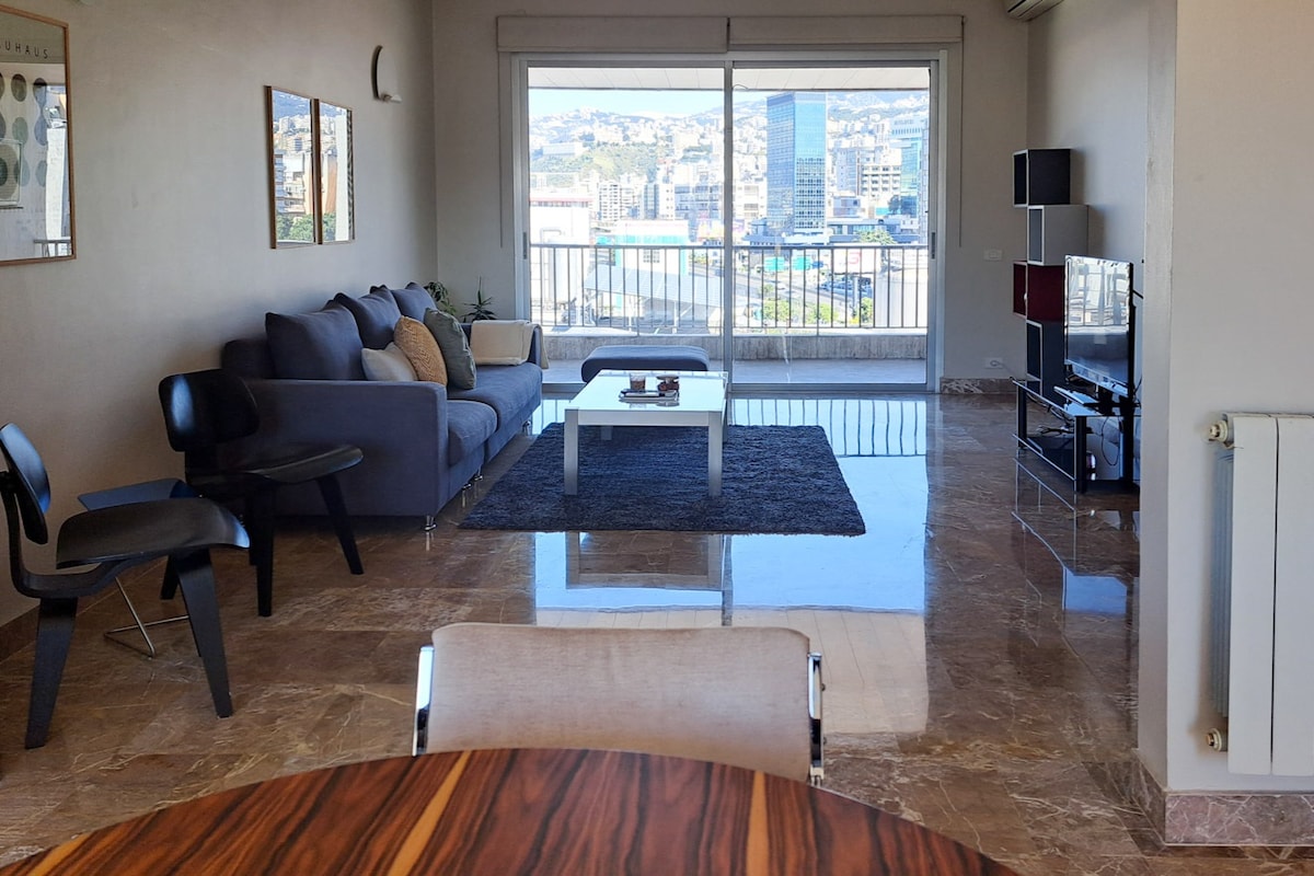 Welcome to our cozy apartment with a stunning Beirut coastline view. -2 Bedrooms (1 king bed - 2 single beds) -3 Bathrooms -Spacious Living room -Kitchen: Fully equipped. -1 Enclosed & 1 Open Balconies Within 10m: -24/7 grocery shop (dekkene) -Canadian burger snack -Local bakery (furn) Additional features: -Massage Chair (free) -Panoramic Views: Sea, mountains, Beirut, and highway. -Shisha Cafes & Restaurants: 20m away. -Appartment Freshly Renovated -Shopping: ABC, Le Mall, Spinneys market
