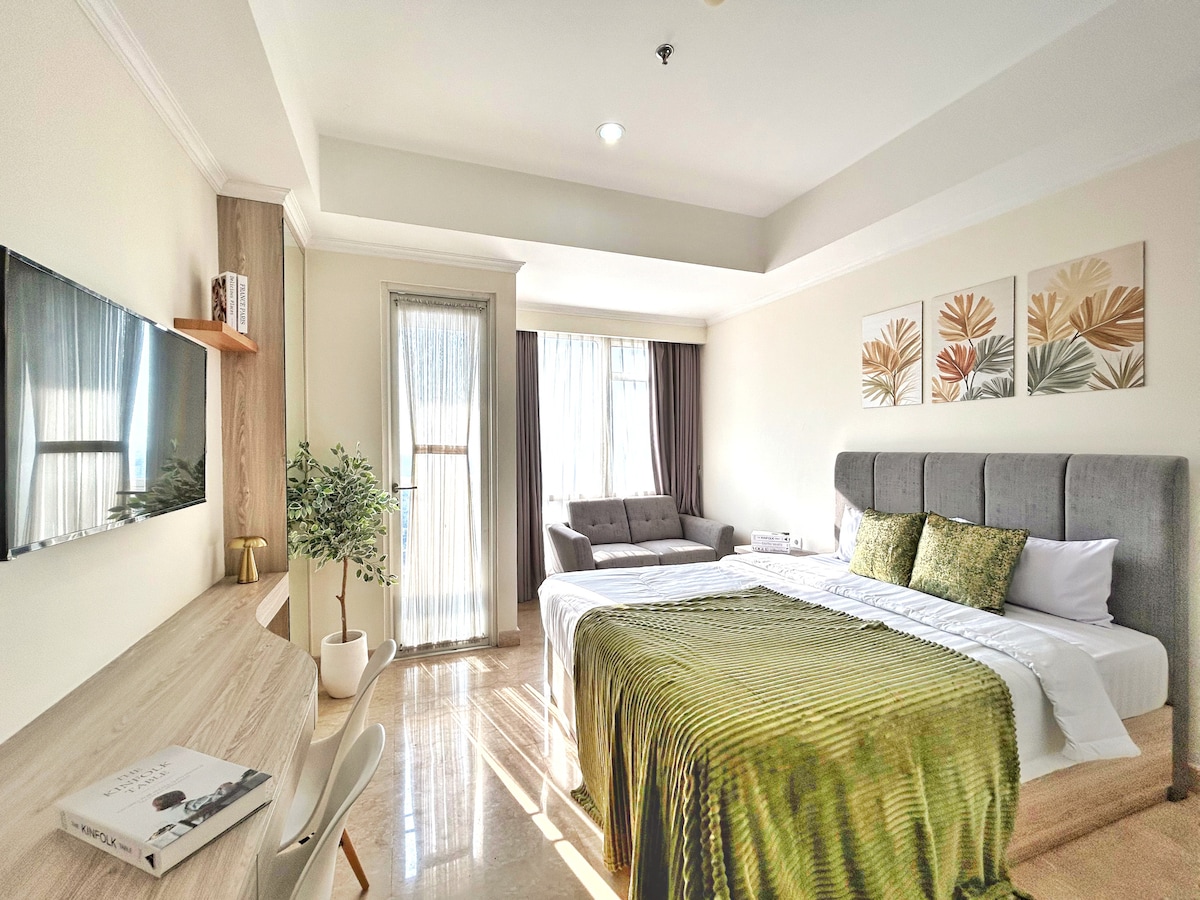 Elegant 24sqm studio in Jakarta's center, blending style and convenience. Includes kitchen, fast Wi-Fi, air-purification, 43" smart TV, sound system and Netflix. It is ideal for various stay types, with contactless access and amenities like pools, jacuzzi, gym, and basketball, Now features a Reverse Osmosis dispenser & food waste disposal, The picture shows a gas stove that has been replaced by an induction cooker (to follow the apartment guidelines for fire hazards)