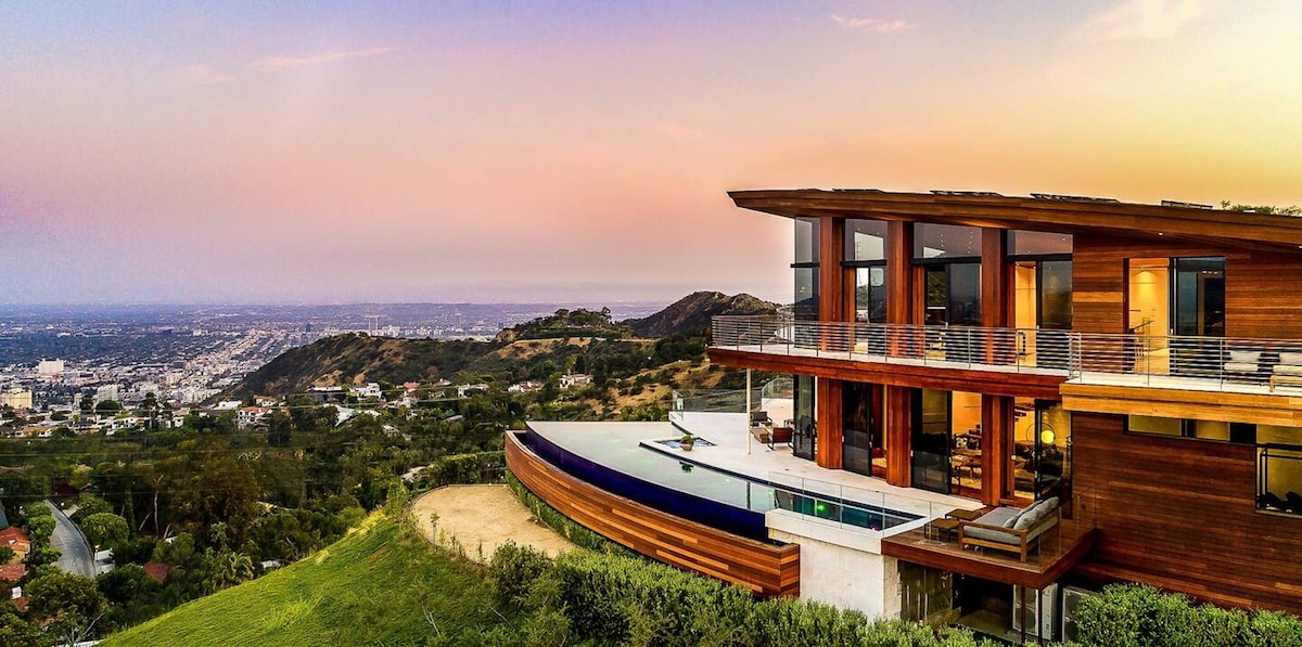 Curving to a sharp point that reaches over the infinity pool, this modern house juts like the bow of a ship over water just off Mulholland Drive. Dip in the pool or hot tub, chill by the heat lamps or fire pit, and retreat to rooms with even wider balcony views. Curved couches, a live-edge dining table, and limestone flooring go bold, and you're perched just 2 miles from Hollywood Bowl.