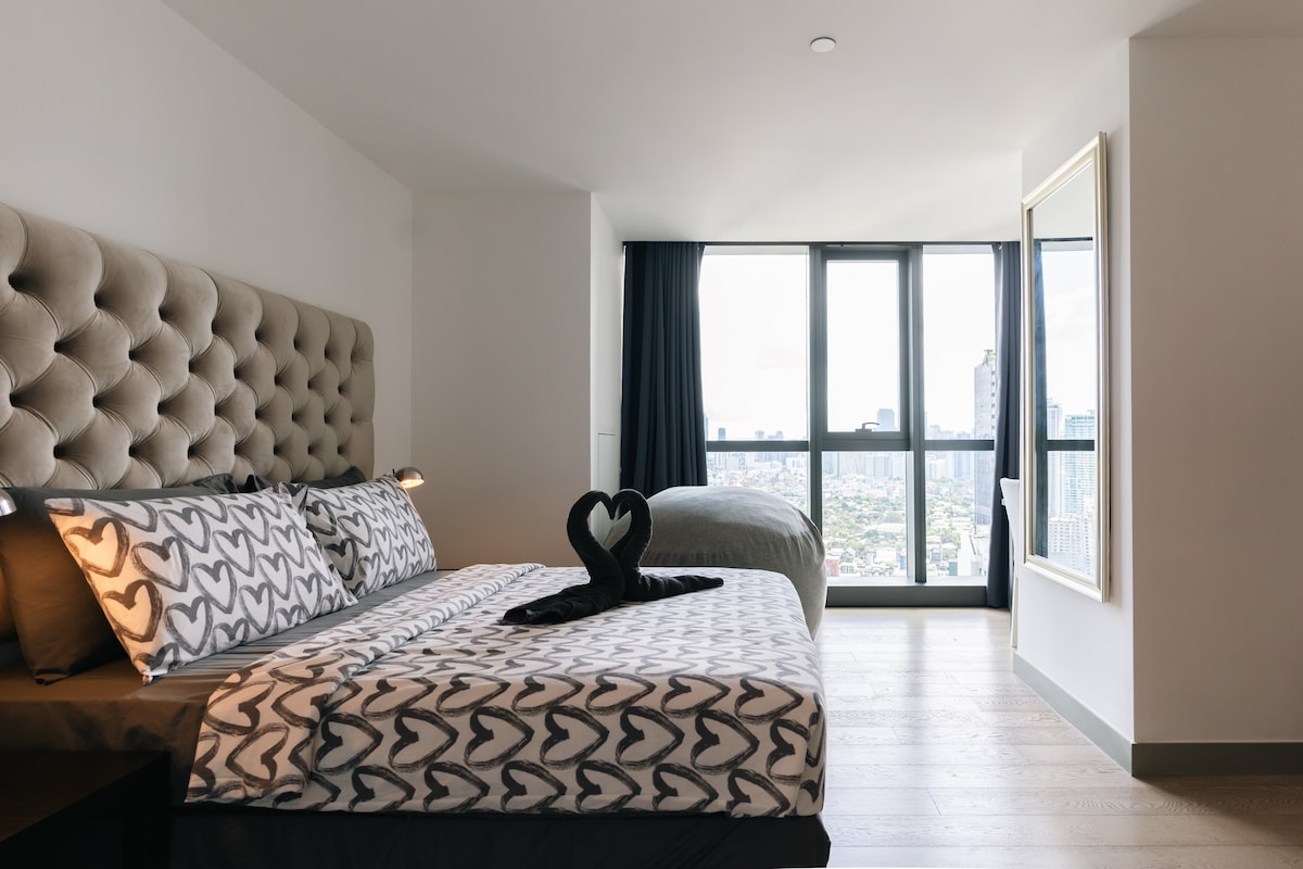 All-organic modern interiors + Crate & Barrel furnishings 78-SQM brand-new upper scale condo 180° wraparound balcony w/ Rockwell skyline views + outdoor set Queen bed w/ Tempur topper 1000 thread count linens & goose down pillows Ogawa massage chair De'Longhi coffee machine Fully stocked kitchen & coffee bar 50" Samsung TV (Netflix) + high-speed WiFi FREE welcome basket (toothbrush, slippers, shaver) Full toiletries provided 24/7 security Self check in anytime FREE access to gym, pool & parking