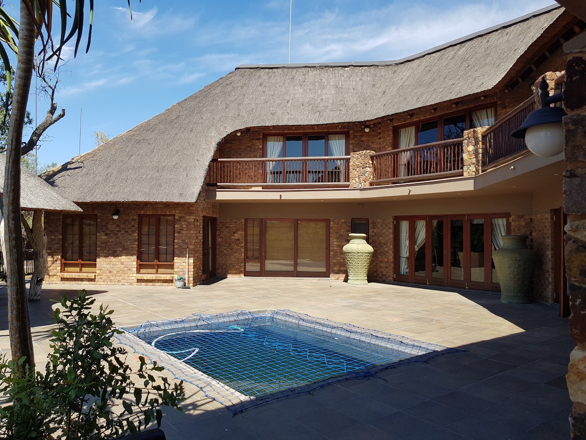 Complimentary Sparkling Wine on arrival ✨ Game Lodge with 3 separate lodges in spacious entertainment area. Located in Zebula Golf Resort & Spa voted in top 10 golf resorts in SA by tripsavvy. Teaming with game, malaria free & 2 hours drive from Jhb. Enjoy sunsets in the bush, games of golf, animals visiting you, spa treatments, delicious meals at 3 restaurants & game drives with the Big 5. 4 of the 5 bedrooms have aircon, 2 fireplaces, bar with bar fridges, patio, private swimming pool & boma.