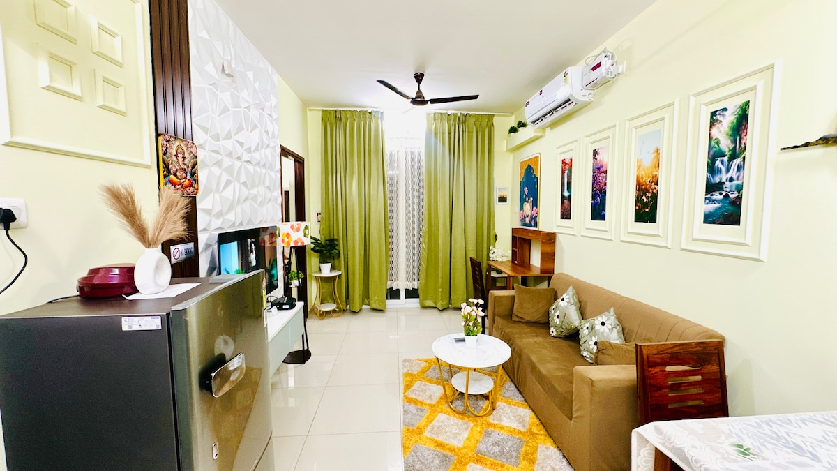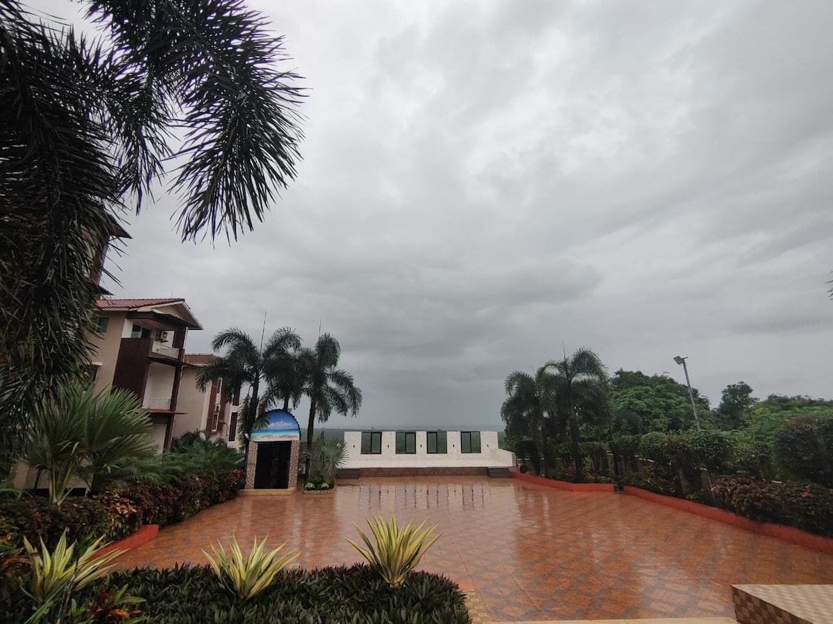 Enjoy the perks of choosing a centrally located apartment in the state of Goa which is just 15 mins away from Goa Intnl Airport.This cosy 1 BHK has a fully equipped kitchen, a queen size bed, an AC in the bedroom, a sofa cum bed, 2 single extra mattresses & 2 bathrooms comfortable for 4 guests. The premises has beautiful amenities you can choose from to unwind...enjoy the yoga deck or terrace lounge....gym, squash court, snooker table or relax at the swimming pool...you are spoilt for choice.