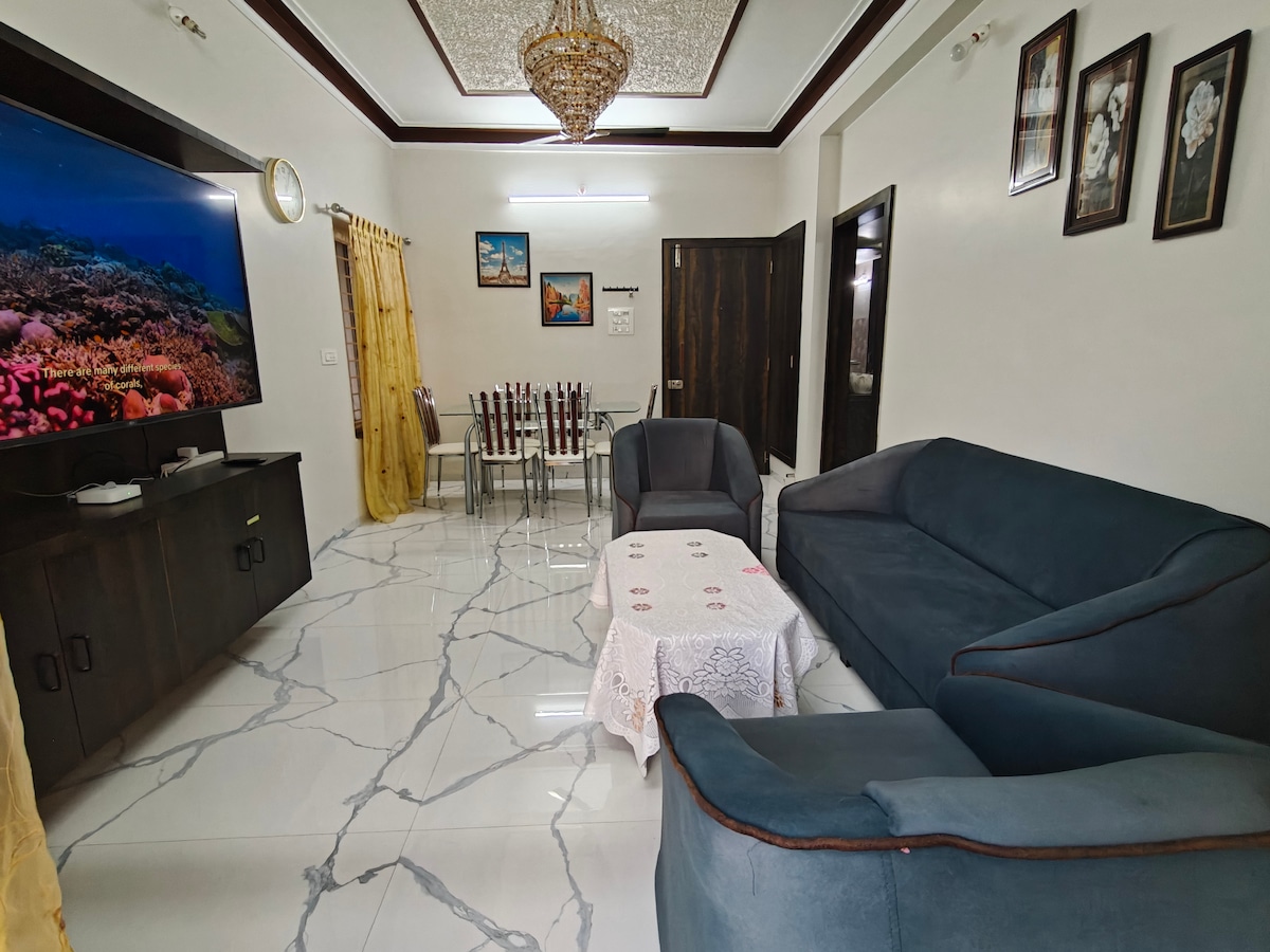 Modern furnished top-floor 1BHK in Balajinagar, Sangli, near Kupwad & Miraj MIDC. Bright living room with large glass window and open views, 55” Smart TV, high-speed WiFi and sofa-cum-bed. Fully equipped modular kitchen, washing machine, bedroom with work desk, hot water and parking. Ideal for corporate stays, couples and small families. Self check-in available.