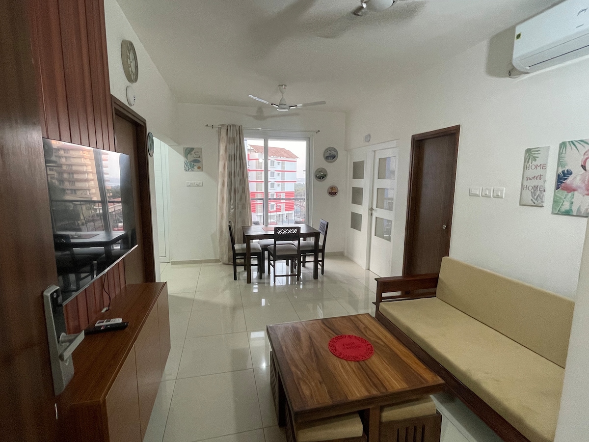The Sea Breeze is a cosy 2 bedroom apartment in a Tata Housing Complex replete with amenities. It is right next to the airport making both North Goa and South Goa easily accessible. The airport is 10 minutes away and the markets are about 2 to 5 minutes depending on what you need. There is a 30m pool in the complex. This apartment is perfect for a workcation, staycation or a family getaway.