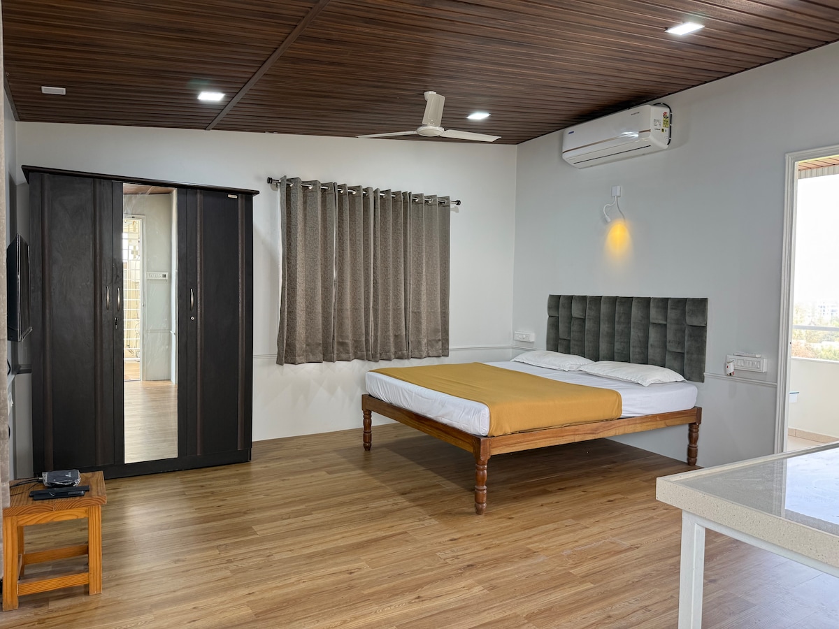 Mirje’s Deck is a cosy & luxurious 3 Bedroom with 2 attached bathrooms, in the heart of Kolhapur, designed for families and groups seeking comfort and peace. Enjoy elegant bedrooms, modern baths, AC, Wi-Fi, and Tata Sky HD. Cook your favourites in the fully equipped kitchen, then unwind on two serene outdoor decks—sip coffee at sunrise or relax under sunset skies. A perfect blend of luxury, warmth, nature, and style for your Kolhapur stay.