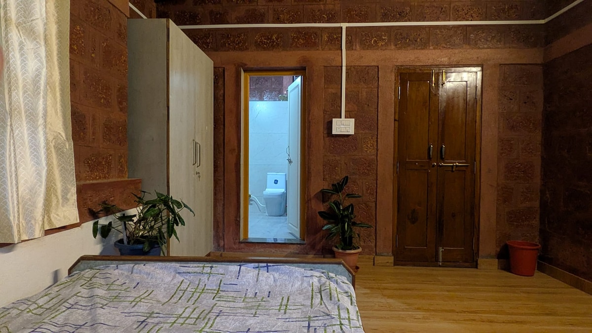 Charming retreat in the heart of Belgaum. Built with traditional red laterite stone, this cozy room offers a unique blend of rustic warmth and modern luxury. * Features high ceilings, cool stone walls, and a spacious bedroom with a dedicated workspace. * Modern Bath: Enjoy a newly constructed bathroom with premium gold fixtures and a rain shower. * Relax: Unwind on the breezy private veranda surrounded by plants. Perfect for couples or solo travellers looking for a peaceful, authentic stay.