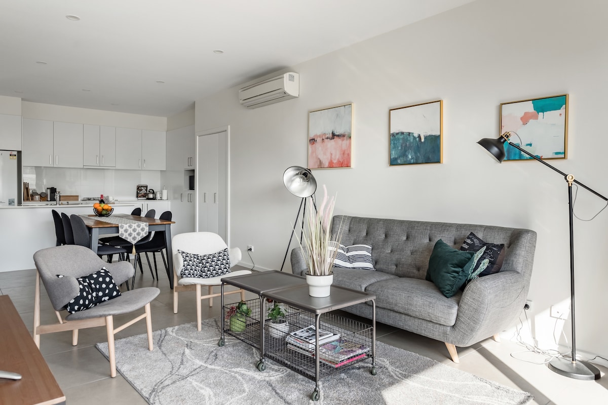 Brand new stylish and relaxing 2-bedroom apartment at a central location in ACT. - 2 x bedrooms with blockout curtains. - 1 x fully equipped bathroom - Fully equipped kitchen, laundry, and bathroom. - 2 air-conditioners for your comfort. - Smart TV with wifi. - One secure underground parking space with visitor parking. - Large balcony with great views The location - Close to UC, CIT, NCH, AIS Arena and GIO Stadium - Westfield shopping centre and amenities within 10 minutes travel.