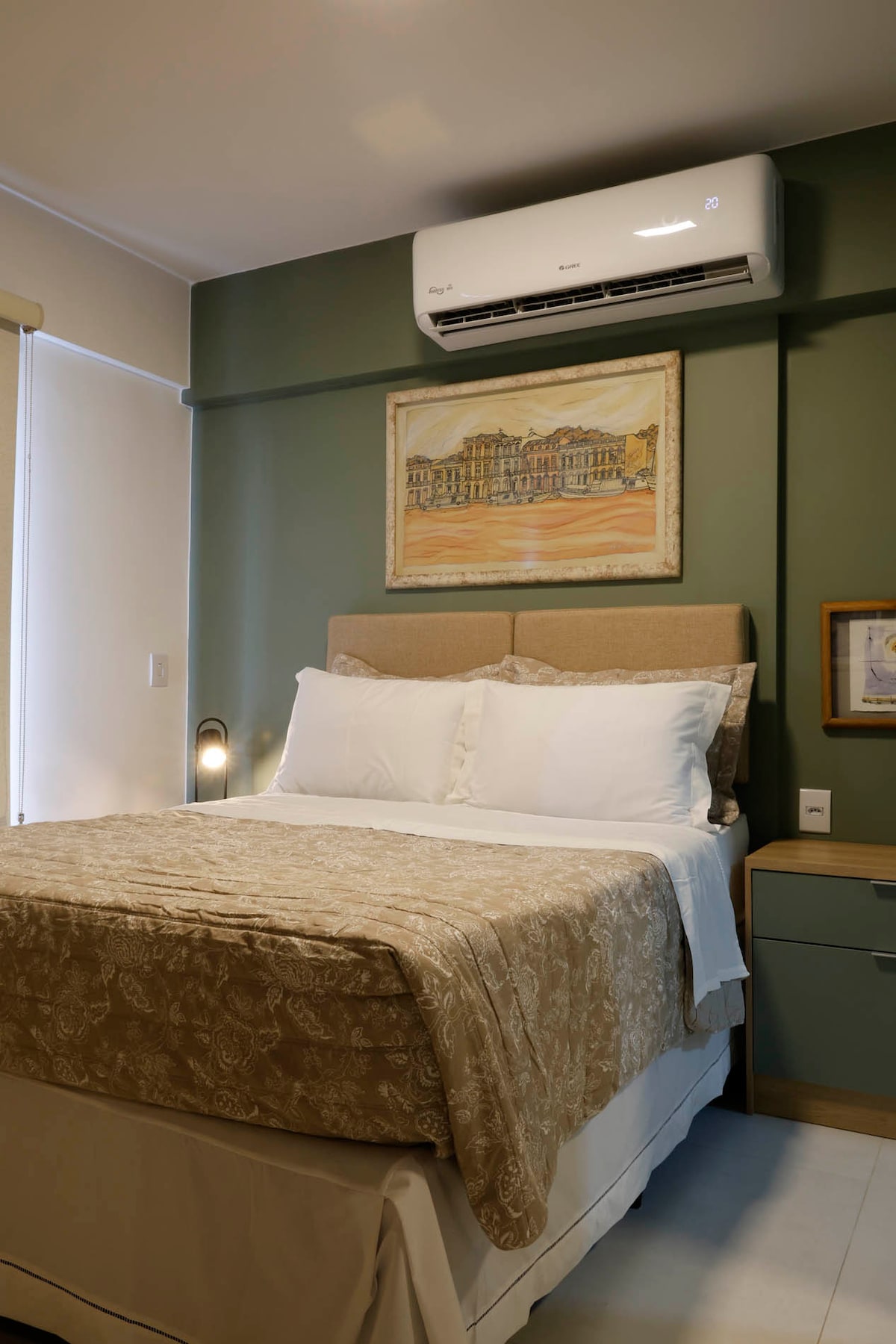 Desfrute de uma experiência premium com vista panorâmica de Belém. O Studio se destaca pela funcionalidade: a divisória com porta separa o quarto do estar, oferecendo privacidade superior. Relaxe na cama de casal ou no sofá-cama confortável (ideal para o 3º hóspede). O entretenimento é garantido na Smart TV 65", que inclui Netflix Premium no plano. A cozinha é completa e o Studio oferece chuveiro elétrico, secador de cabelo e ferro. Sua tranquilidade é completa com a garagem coberta exclusiva.