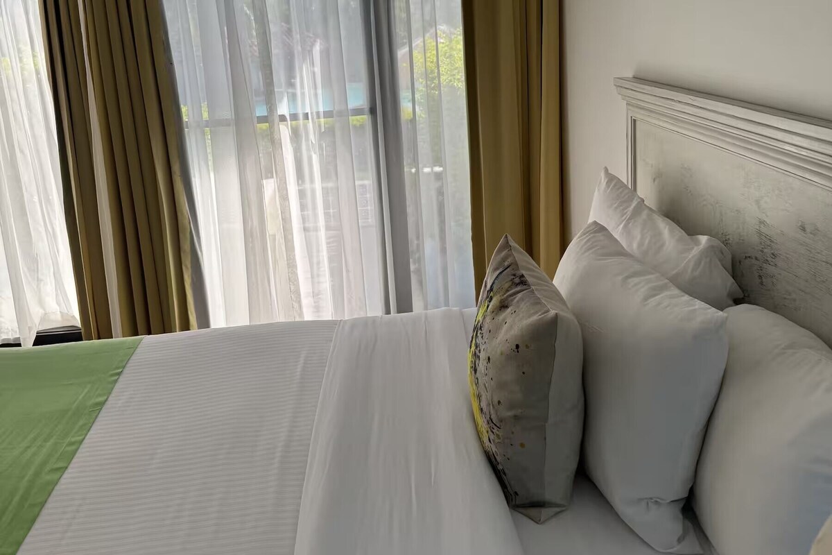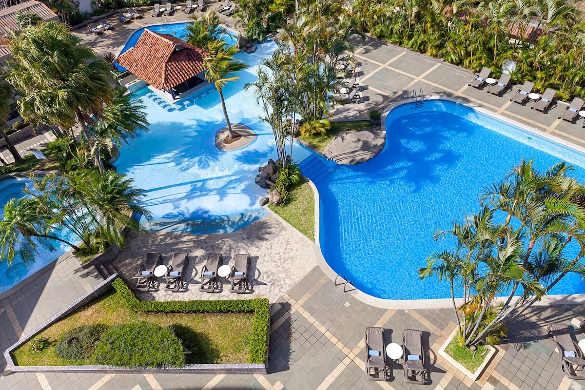CR Stays Welcomes you to this fully-equipped studio just 4 miles from Juan Santamaría Airport. Enjoy breathtaking views of the Escazú mountains, a king bed, queen sofa bed, fast Wi-Fi, and air conditioning—ideal for 4 guests. The building boasts a gym, pool, BBQ terrace, private cinema, and meeting rooms. Minutes from Plaza Real Cariari’s shops and restaurants, and located in a prime business hub. 24/7 security for a safe, stylish, and comfortable stay.