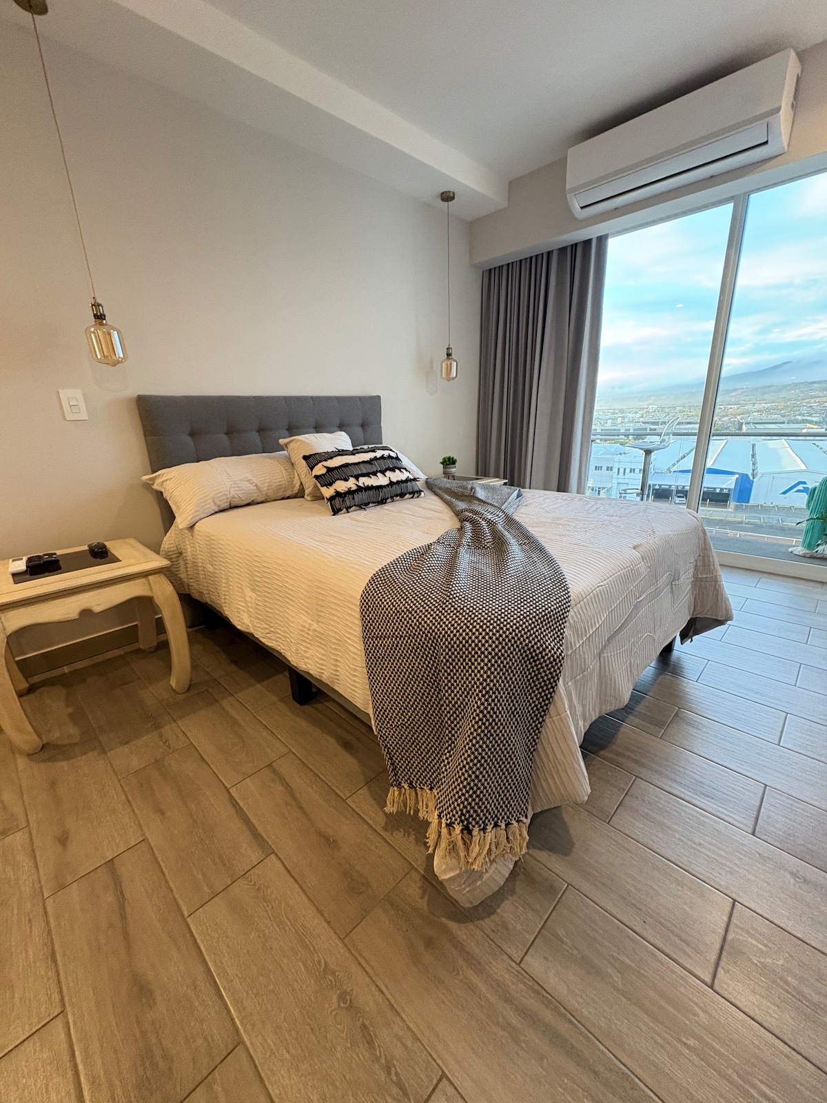 CR Stays Welcomes you to this fully-equipped studio just 4 miles from Juan Santamaría Airport. Enjoy breathtaking views of the Escazú mountains, a king bed, queen sofa bed, fast Wi-Fi, and air conditioning—ideal for 4 guests. The building boasts a gym, pool, BBQ terrace, private cinema, and meeting rooms. Minutes from Plaza Real Cariari’s shops and restaurants, and located in a prime business hub. 24/7 security for a safe, stylish, and comfortable stay.