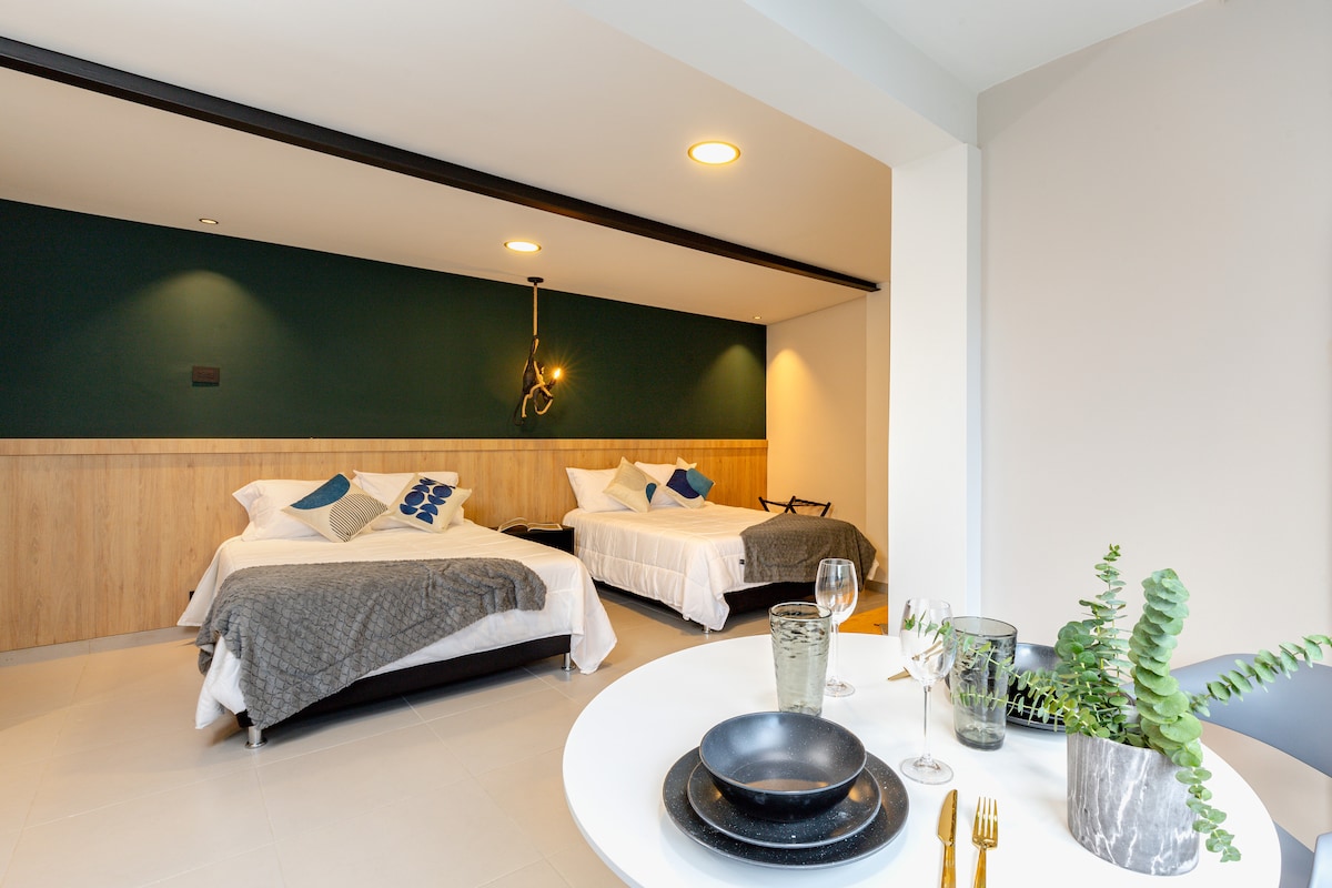 Welcome to your top-floor studio in Laureles! This stylish space mix modern design with cozy comfort, perfect for a relaxing stay. Just a 5-min walk to top restaurants, bars, and local attractions. You’ll experience the city like a local! Unit comes with 1 bath, a full kitchen, A/C, in-unit washer/dryer, private & guest parking. In addition, building offers a free co-working space, high-speed fiber internet, and a balcony with views. Also, 24/7 security provides peace of mind during your stay.