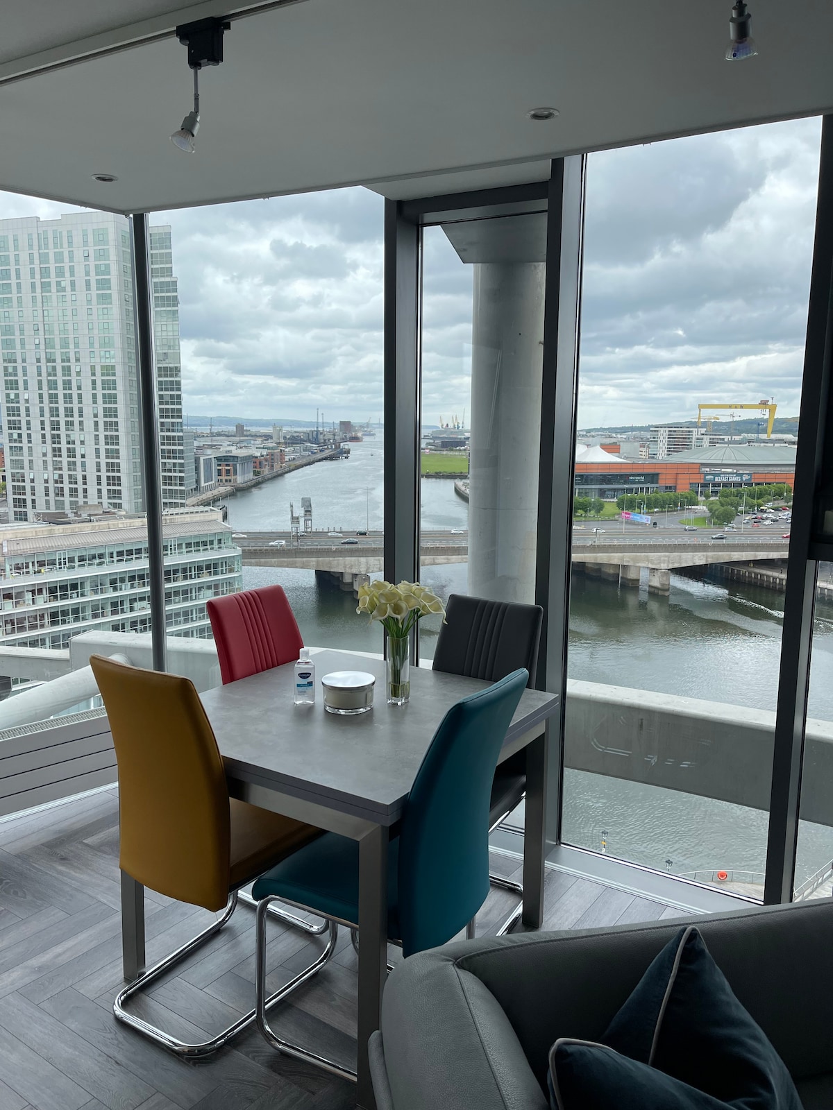Enjoy luxury accommodation in the heart of Belfast City Centre at the iconic Boat Apartment building. This stunning 3 bedroom, 3 bathroom, 11th floor apartment comes with a complete kitchen, dining, and living space, all with spectacular views of Belfast's most beloved sights. This private, elevator building boasts three outdoor balconies with amazing views accessed via the lounge, kitchen and master bedroom. Enjoy your Belfast City break from the beauty and comfort of this stunning property.