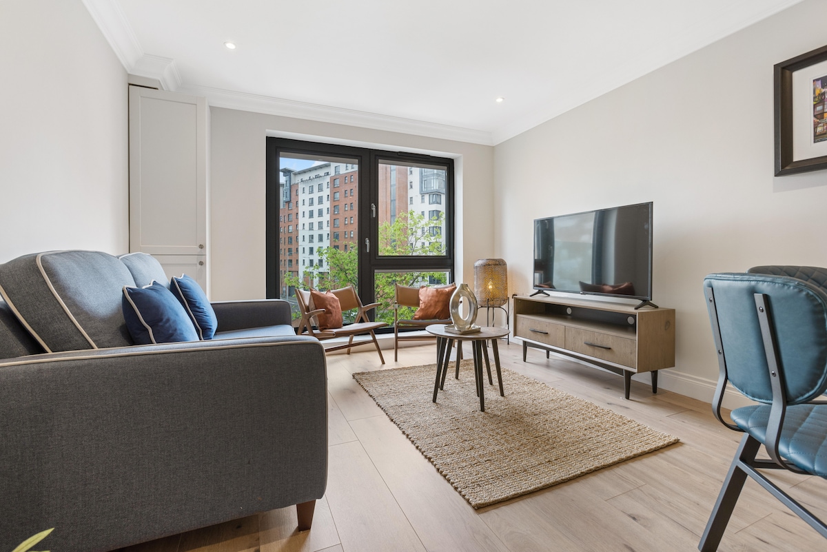 Welcome to this spacious and modern East Village apartment. - Two double bedrooms with ultra-comfy mattresses - Luxurious living room with a 43” HD Smart Roku TV - Fully equipped kitchen with a Dolce Gusto coffee machine - Superfast 1000mb fibre broadband - Access to a street-facing terrace - Walking distance to city centre Perfect for your Belfast city break or business trip.