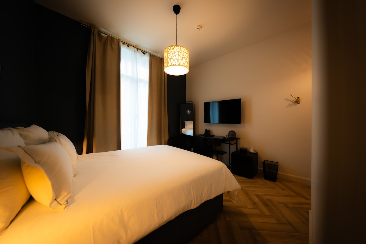 Nichée dans l’esprit du Beffroi classé à l’UNESCO, cette chambre fait résonner l’âme musicale de la ville. Les murs aux accents de pierre grise, les luminaires dorés comme des cloches suspendues, tout rappelle l’écho rassurant du carillon qui rythme la vie montoise. Un lit king-size confortable, un bureau discret, une douche à l’italienne et une télévision connectée avec Netflix. Idéale pour les voyageurs solitaires ou les couples sensibles au moindre tintement de l’histoire.