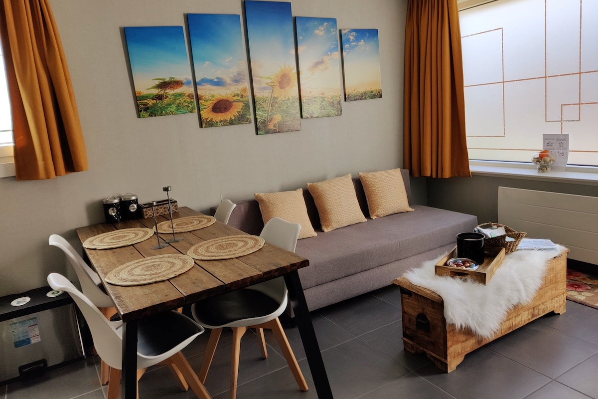 Mooie studio midden in agrarisch gebied en dit op 1 km van zee, strand en duinen! Dankzij het kwalitatieve bed of het luxe zetelbed is een goede nachtrust gegarandeerd. U beschikt er over een zeer groot terras en tuin met trampoline. Parkeren kan gratis voor de deur. Voor de deur passeren diverse fietsroutes (Freddy Maertensroute (42 km), Dijken en geulenroute (38 km), Mountainbikeroute Norbert Dedeckere (29 km), ..... Ook lange afstand fiets- en wandelroutes passeren vlakbij (LF1 en GR5A).