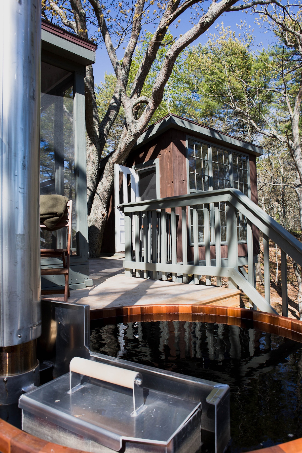 远离尘嚣的度假胜地。木柴热水浴缸、雪鞋