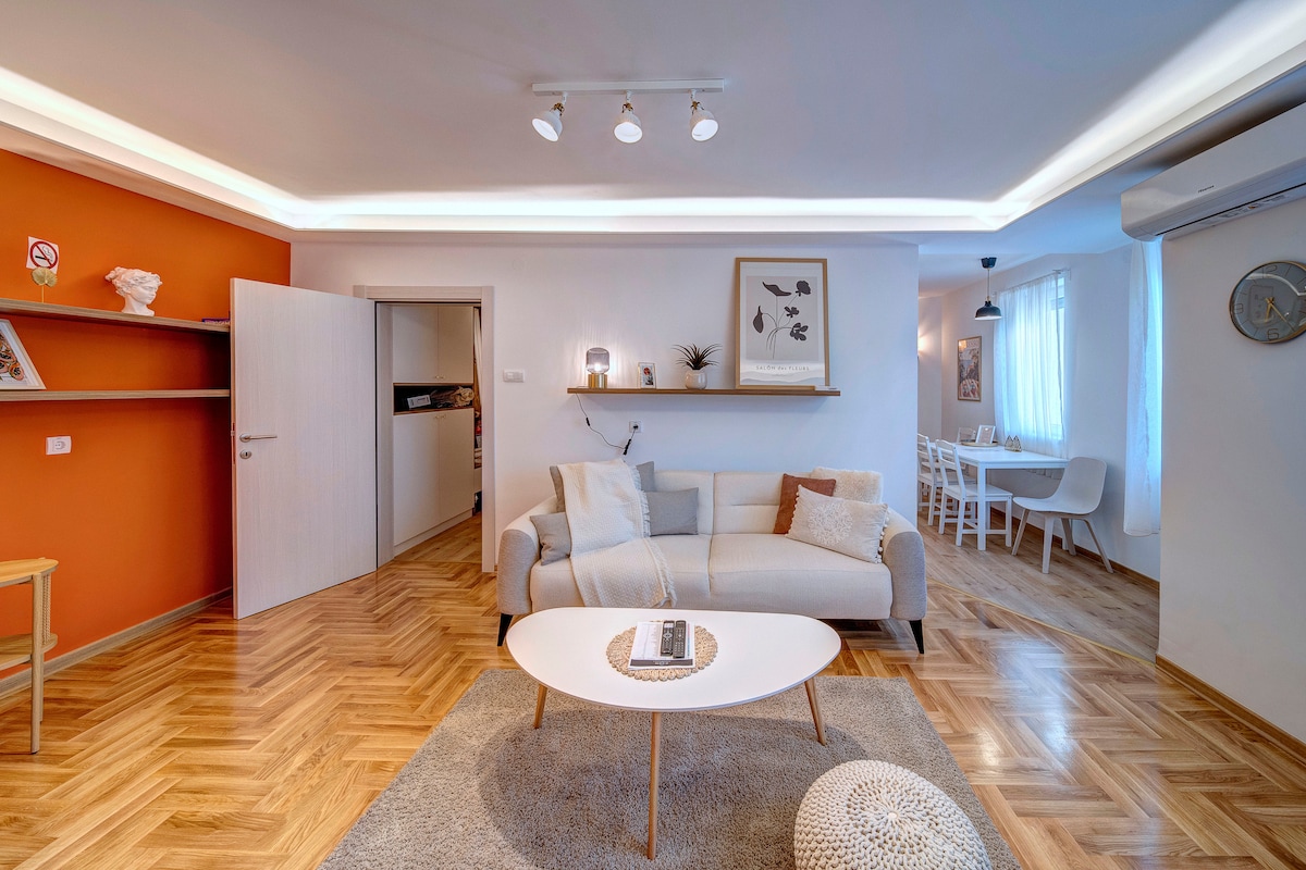 This 80 square meters apartment has two bedrooms divided by large kitchen/dining/living area. The apartment is located in walking distance from major Belgrade touristic sites – National Assembly, Museum, and Theater, Knez Mihajlova street, Kalemegdan Fortress, Skadarlija (the bohemian quarter). The guests can find various food and drink options at nearby restaurants, cafes, and pubs. Some of the top-rated dining places are in this area. There is a 24/7 grocery store down on the corner.