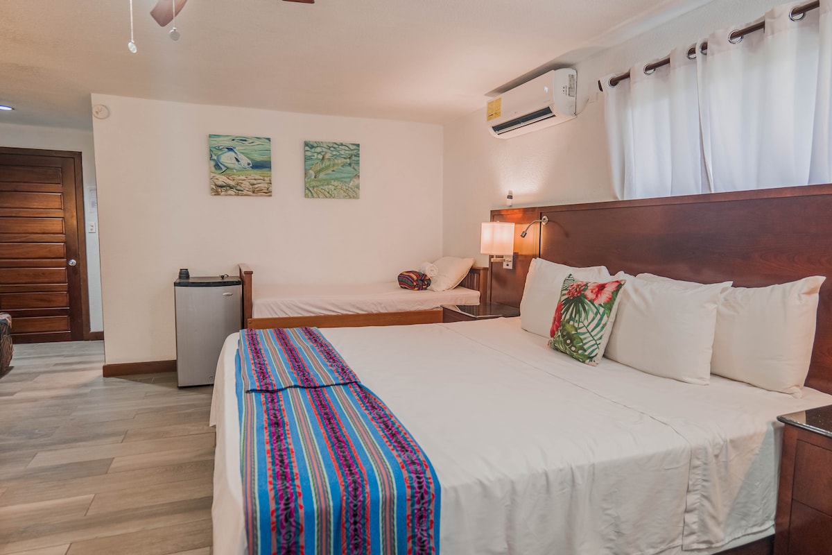 Alright - so this room is top notch. A family room with a private bathroom. Your crew will have 1 king bed, 1 dbl bed, and 1 single bed. Access to the beach. On-Site Restaurant/Bar. Close to best beach bars on Boca Del Rio (Wayos, Sandy Toes, Palapa Bar). There's live music playing Wed-Sat in the area. On-Site Restaurant/Bar. 8-10 min walk from the water taxi.