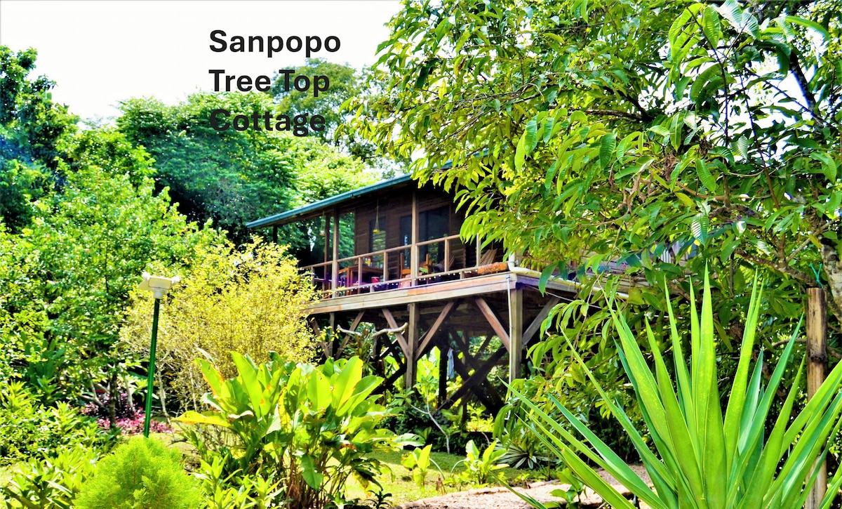 Perched in the Treetops over a Natural 9 ft. deep Jungle Pool, our Treetop is fully Screened for Bug free Living! Sitting room on first level and a screened bedroom with small screened veranda on 2nd level. A futon accommodates a child (7 yrs. or older) on 1st level. The Treetop shares a Common area (50 ft. away) with no more than 2 other guests and includes Hot water, WiFi, Full Kitchen Facilities with dedicated fridge for the Treetop, toilet, sinks, and shower , Dining Gazebo