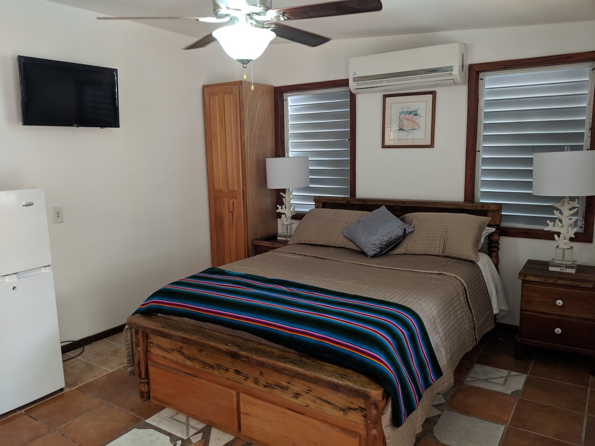 This studio apartment is set North of town but south of the bridge. Set in a safe neighbourhood, walking distance from town and a few minutes away from the popular Boca del Rio beach strip, where you will find Wayo's Beachbar, Sandy Toes and Palapa Bar to name a few. Great for people who will be doing activities all day and need a safe, clean place to relax at night. Apartment includes wifi, coffee maker(free coffee), cable tv, refrigerator, hot & cold shower, air conditioning!